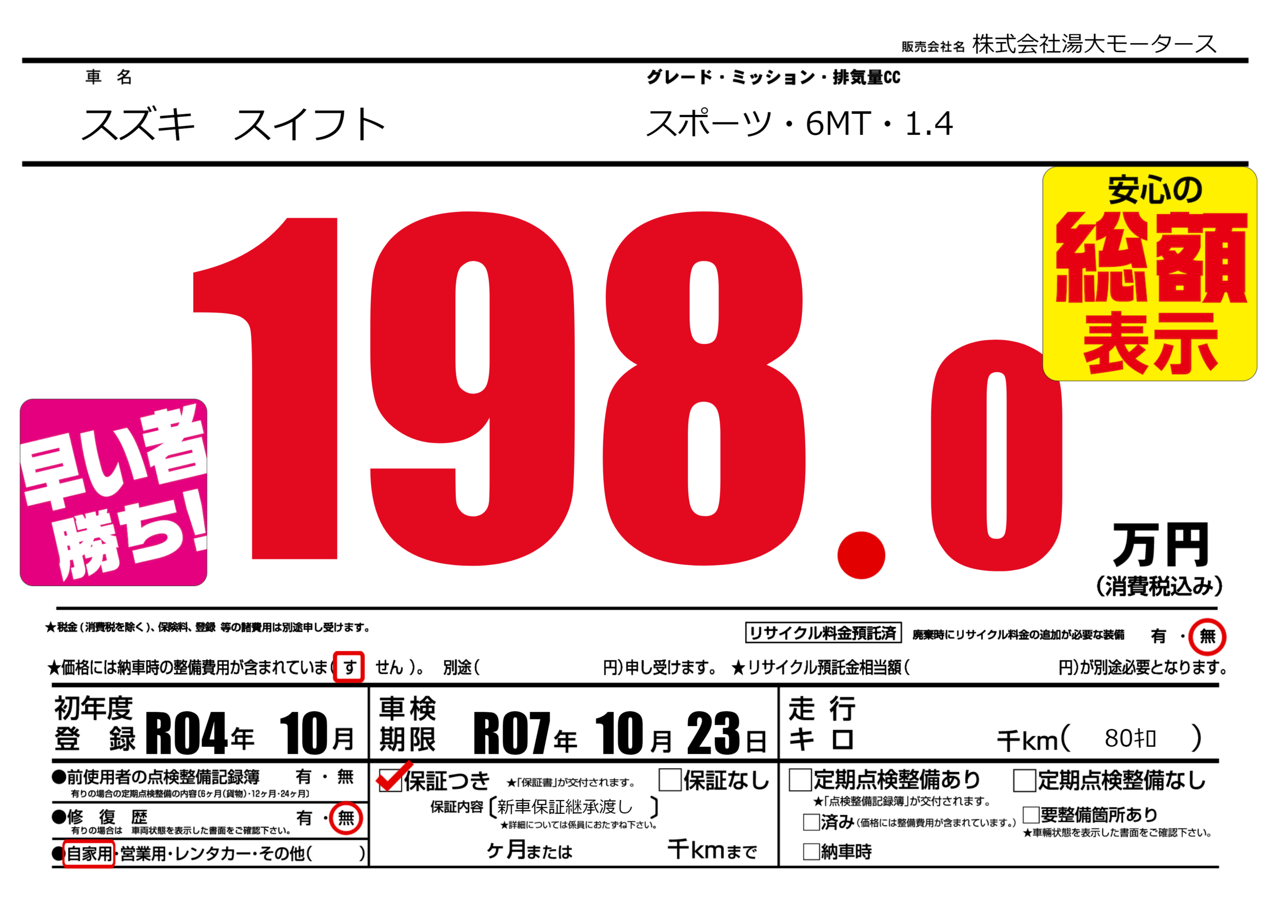 保証付き 保証内容(新車保証継承渡し) ---ヶ月または()千kmまで |