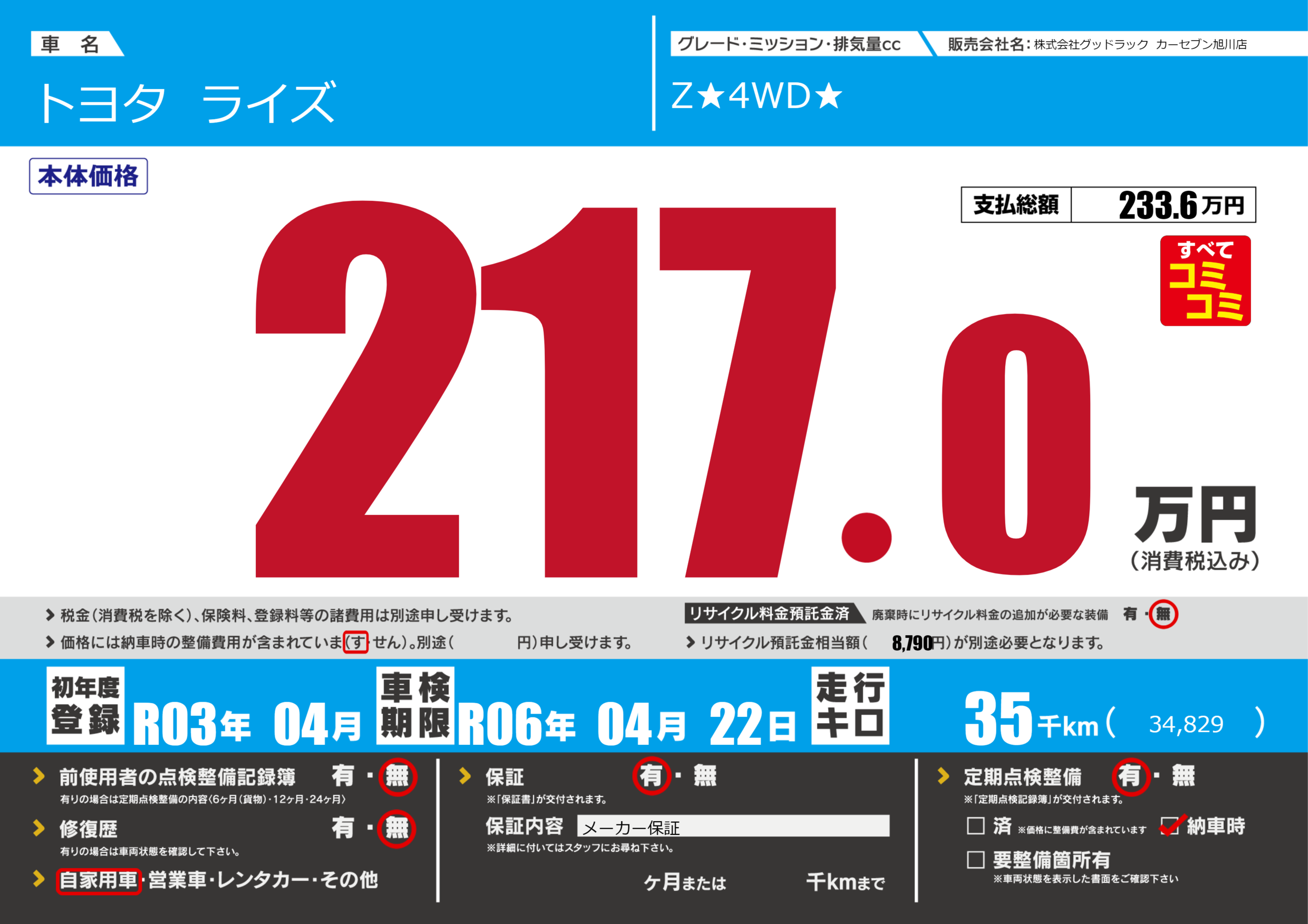 | 車名 | トヨタ ライズ | グレード ミッション 排気量 |