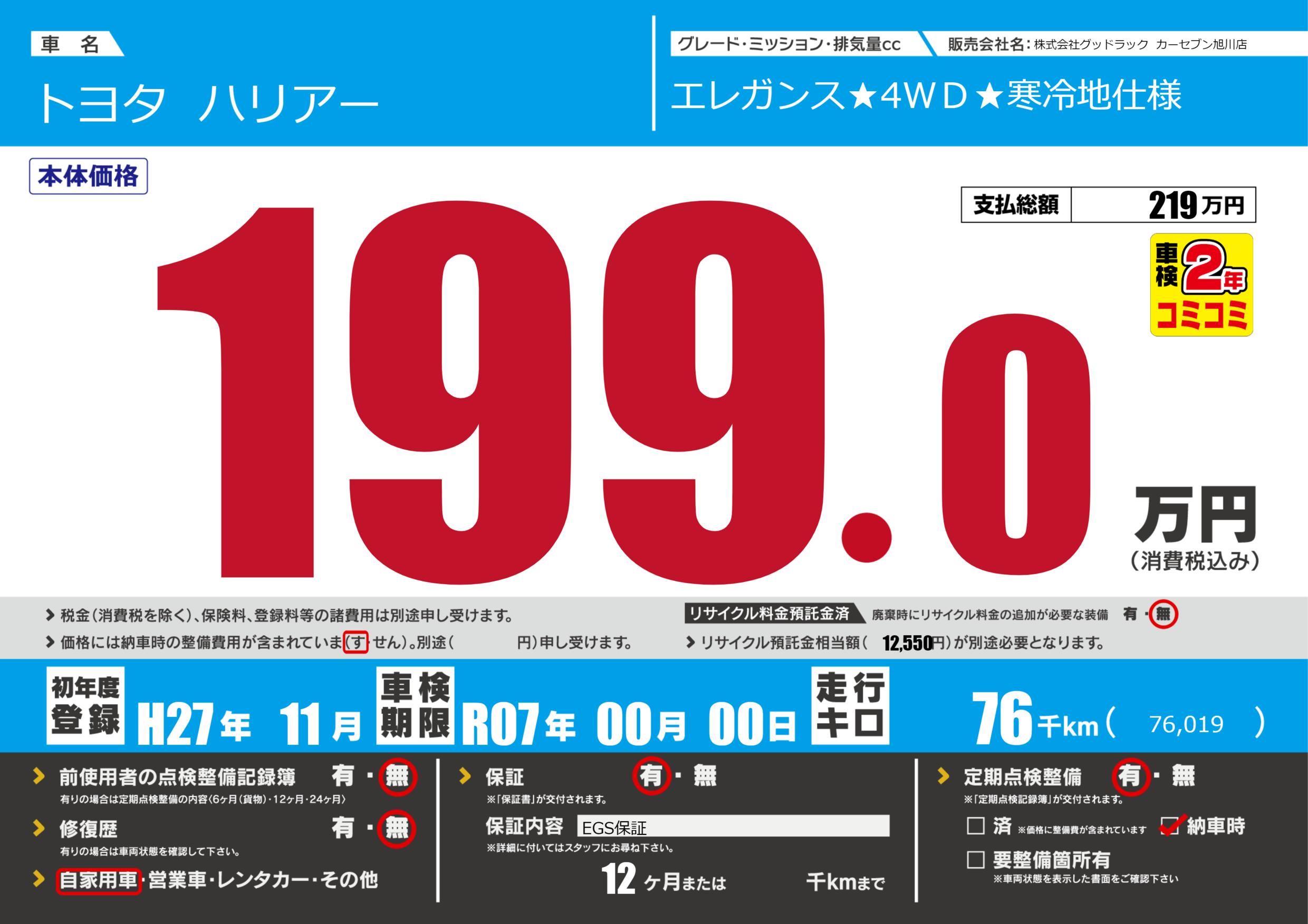 | 走行キロ | 7.6万km | 初年度登録 | H27年11月 |
