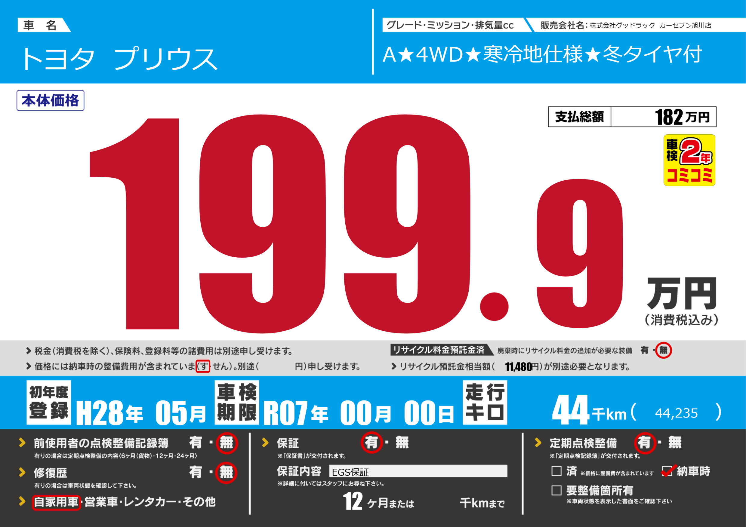 | 車名 | トヨタ プリウス | グレード ミッション 排気量 |