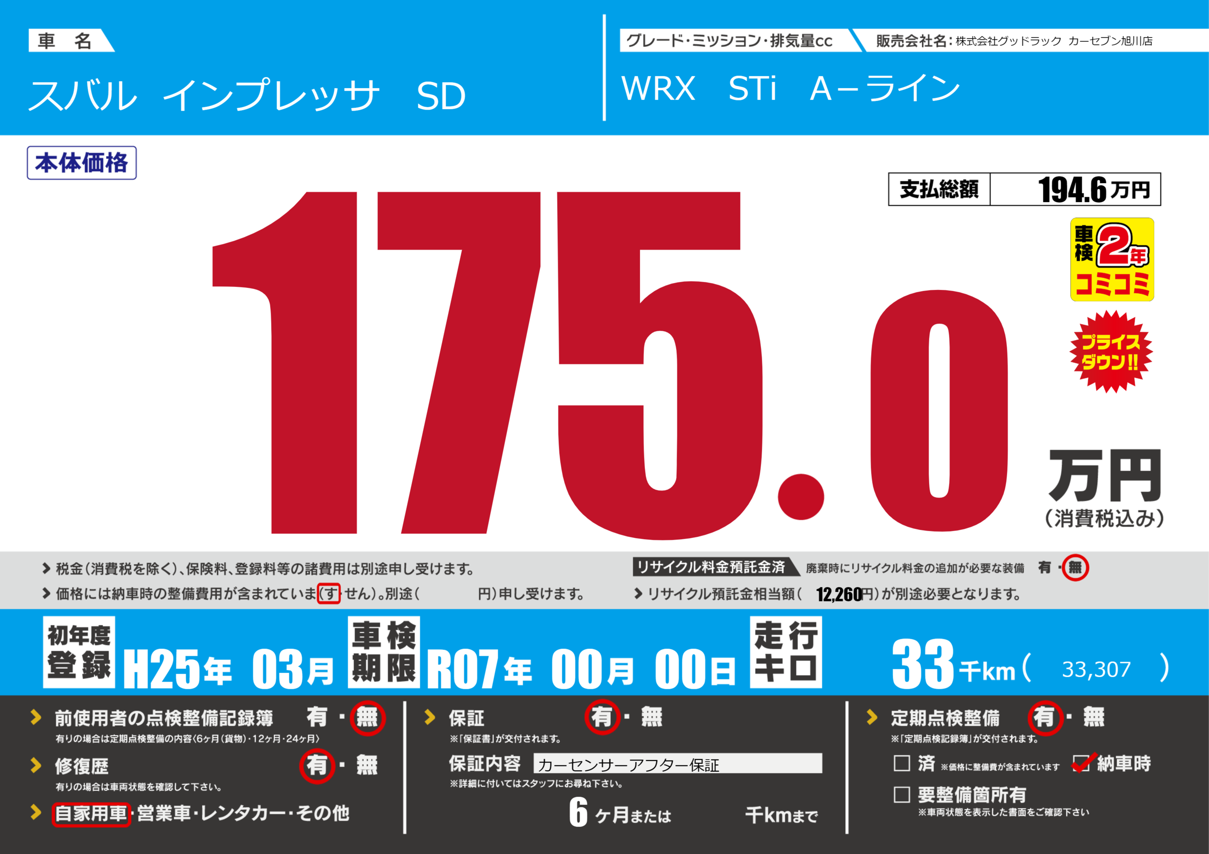| 車名 | スバル インプレッサ SD | グレード ミッション 排気量 |