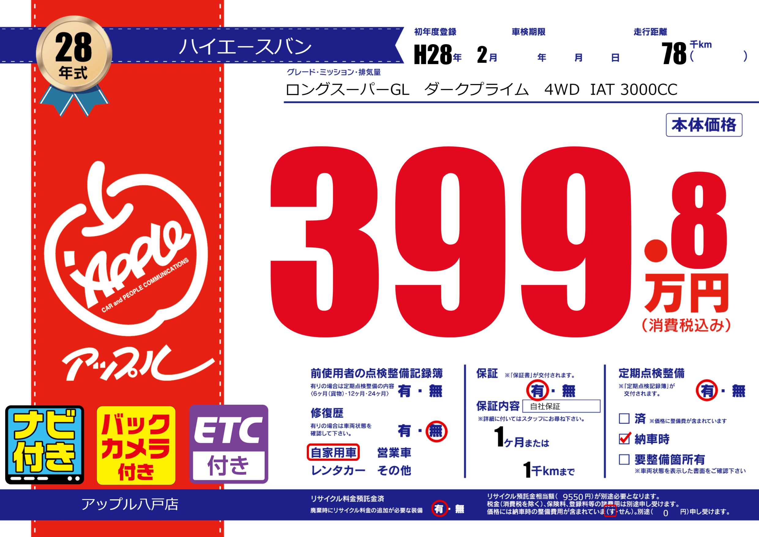 保証付き 保証内容( 自社保証) 1ヶ月または(1)千kmまで |