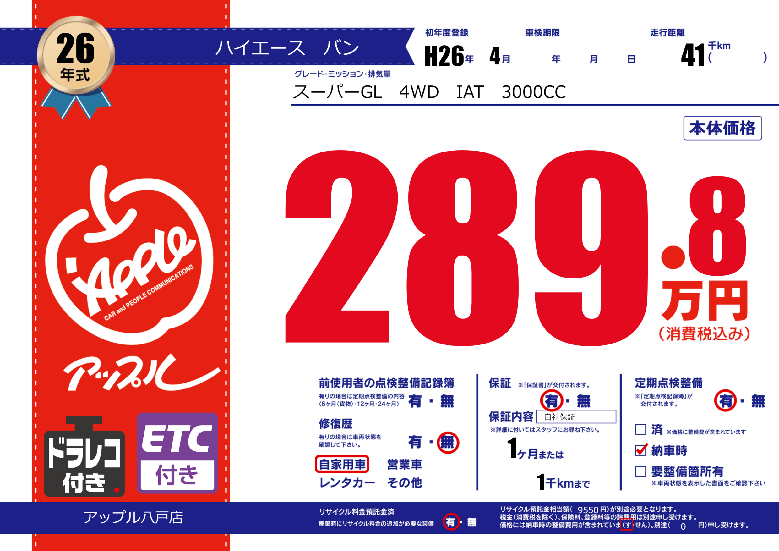 | 車名 | ハイエース バン | グレード ミッション 排気量 |