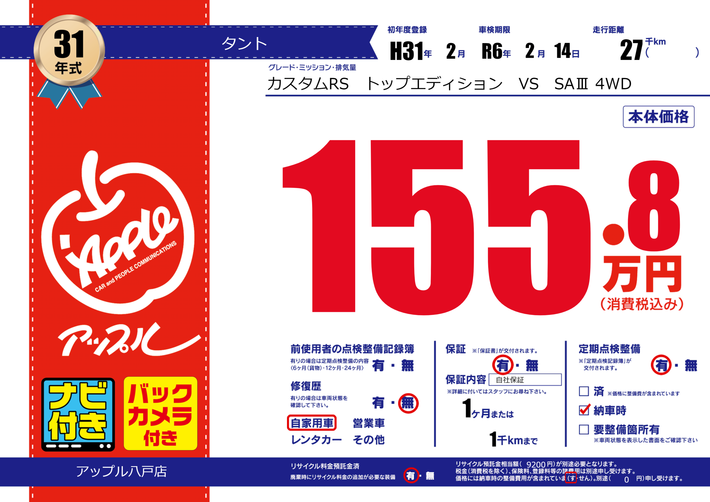 | 走行キロ | 2.7万km | 初年度登録 | H31年2月 |