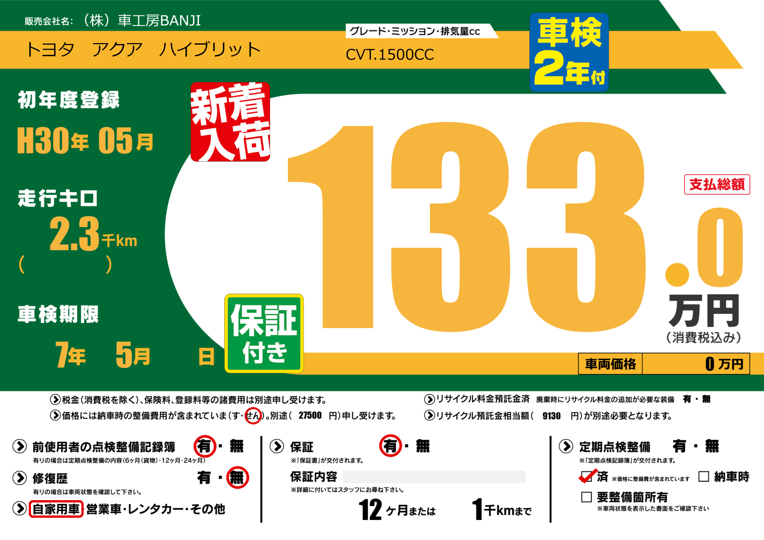 | 定期点検整備 | 定期点検整備済み | ||