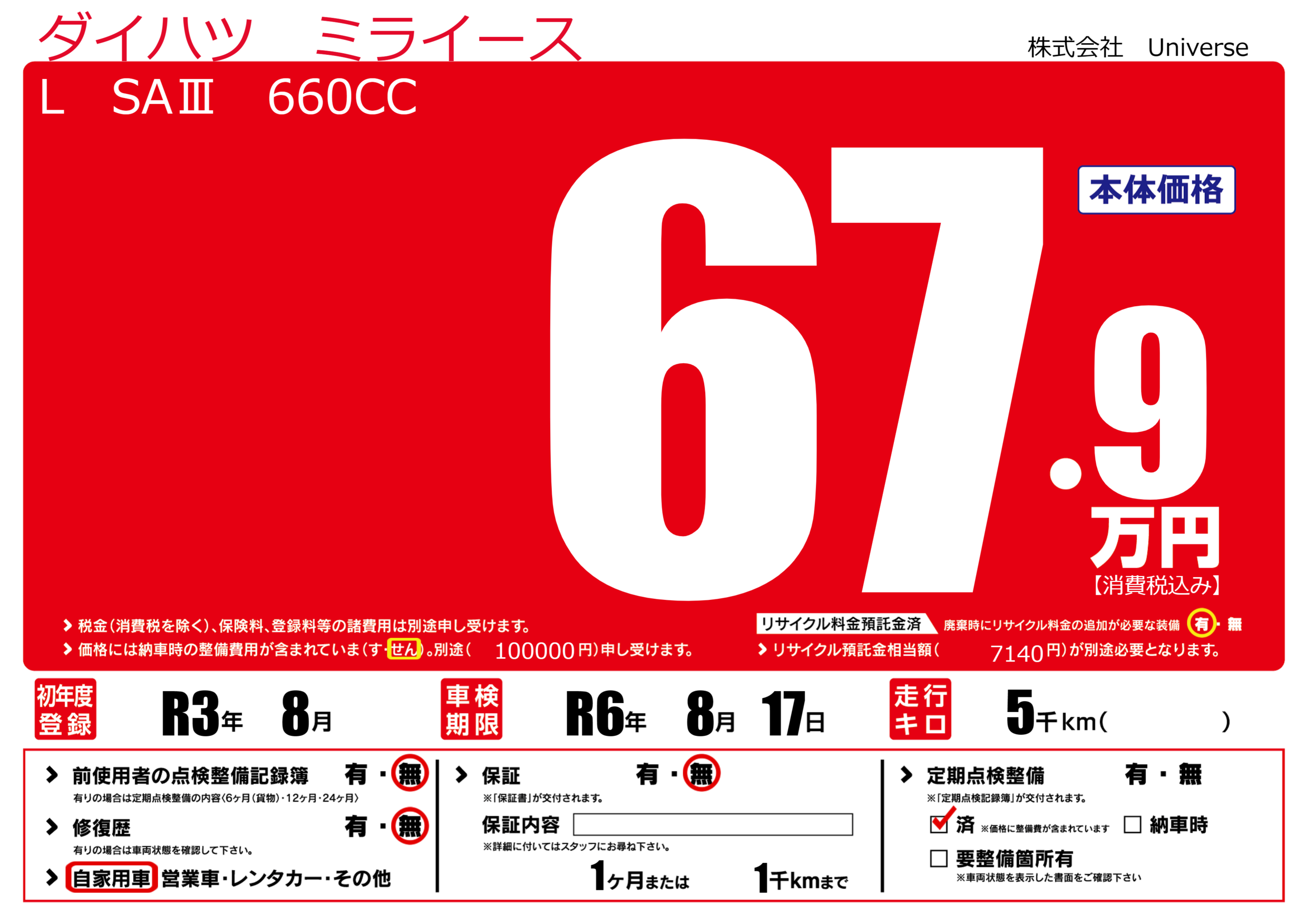 | 定期点検整備 | 定期点検整備済み | ||