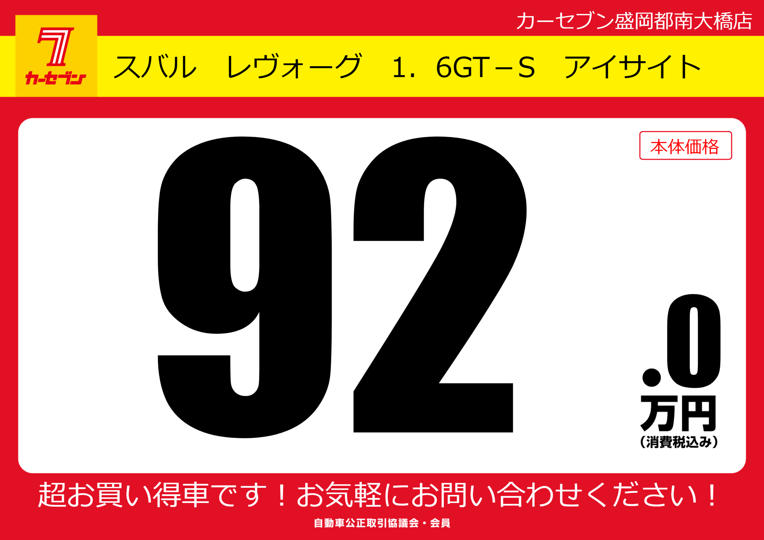 | 車名 | スバル レヴォーグ 1.6GT-S アイサイト | グレード ミッション 排気量 |