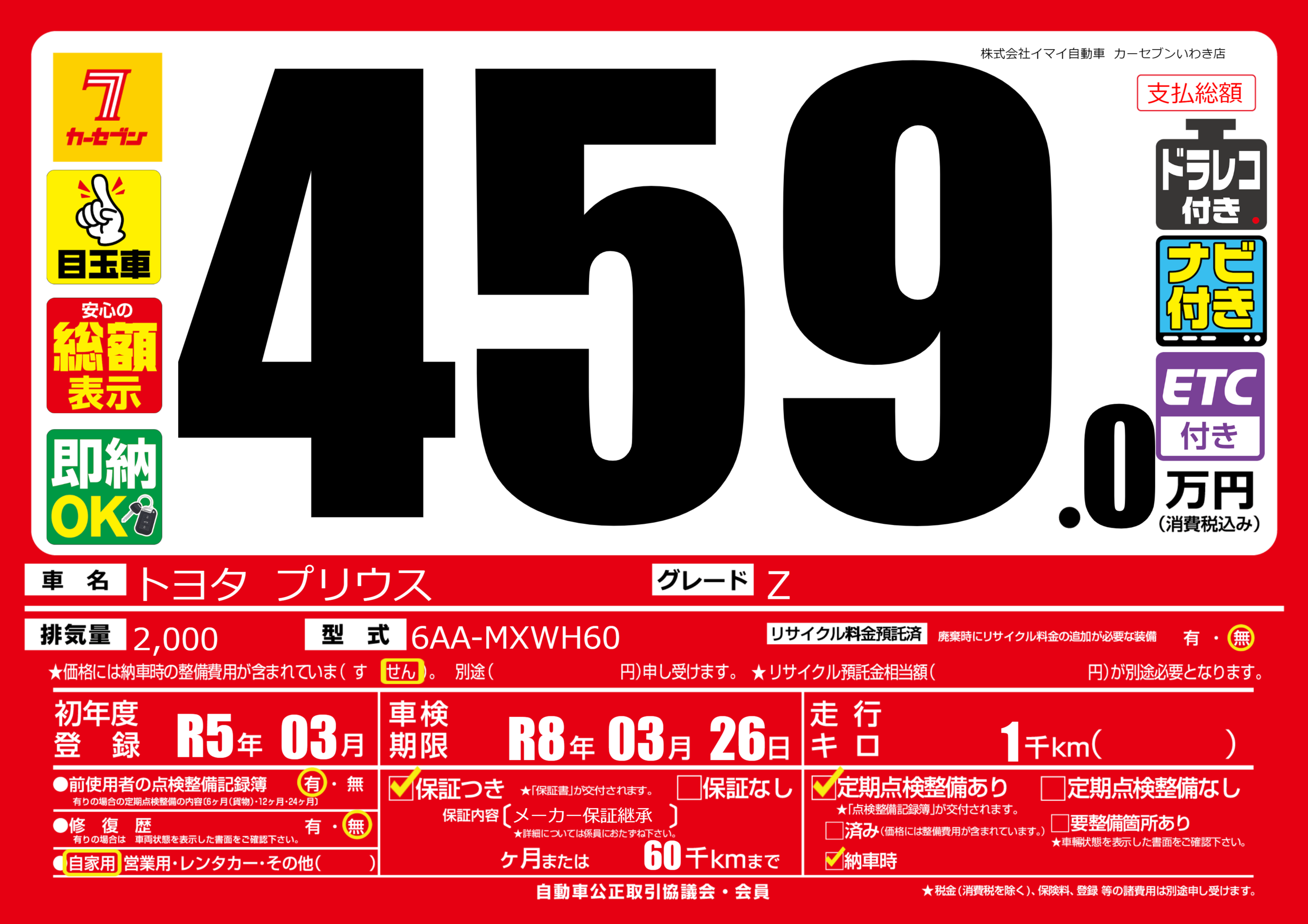 | 車名 | トヨタ プリウス | グレード ミッション 排気量 |