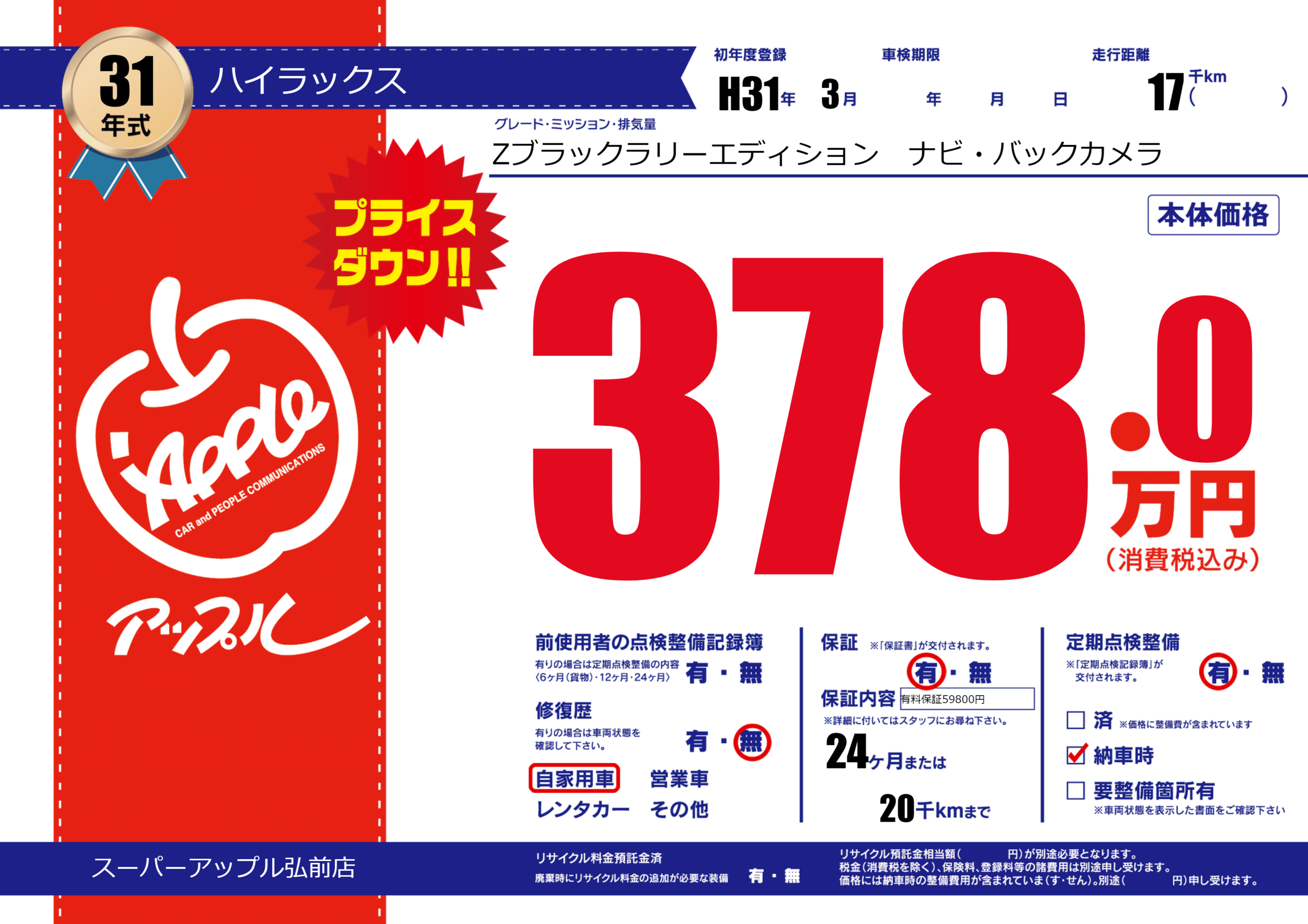 | 走行キロ | 1.7万km | 初年度登録 | H31年3月 |