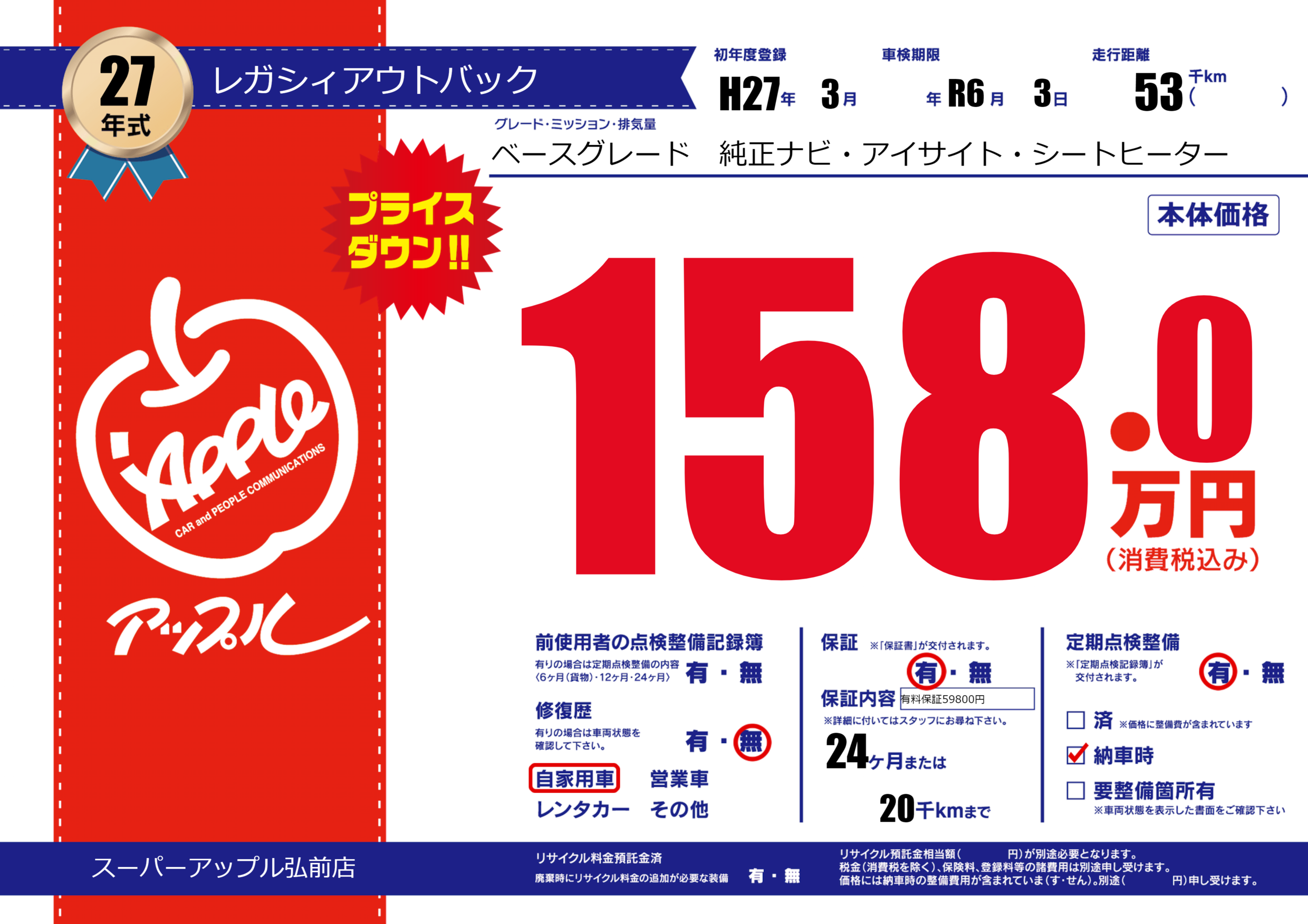 | 走行キロ | 5.3万km | 初年度登録 | H27年3月 |