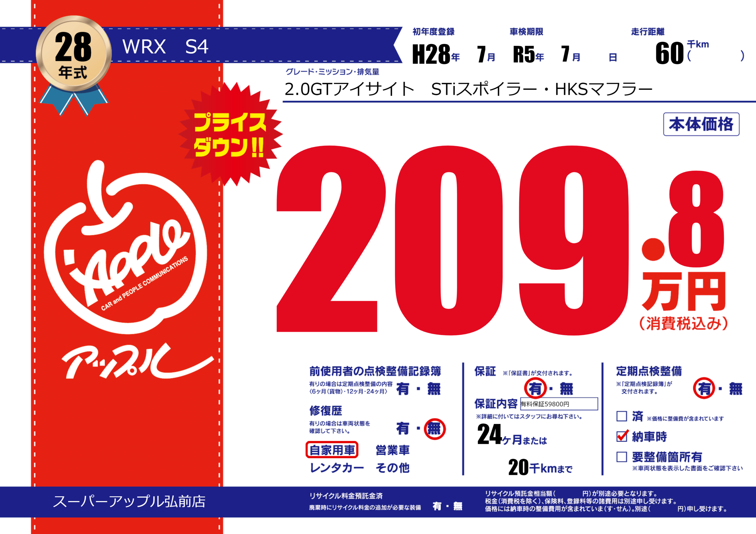 | 車名 | WRX S4 | グレード ミッション 排気量 |