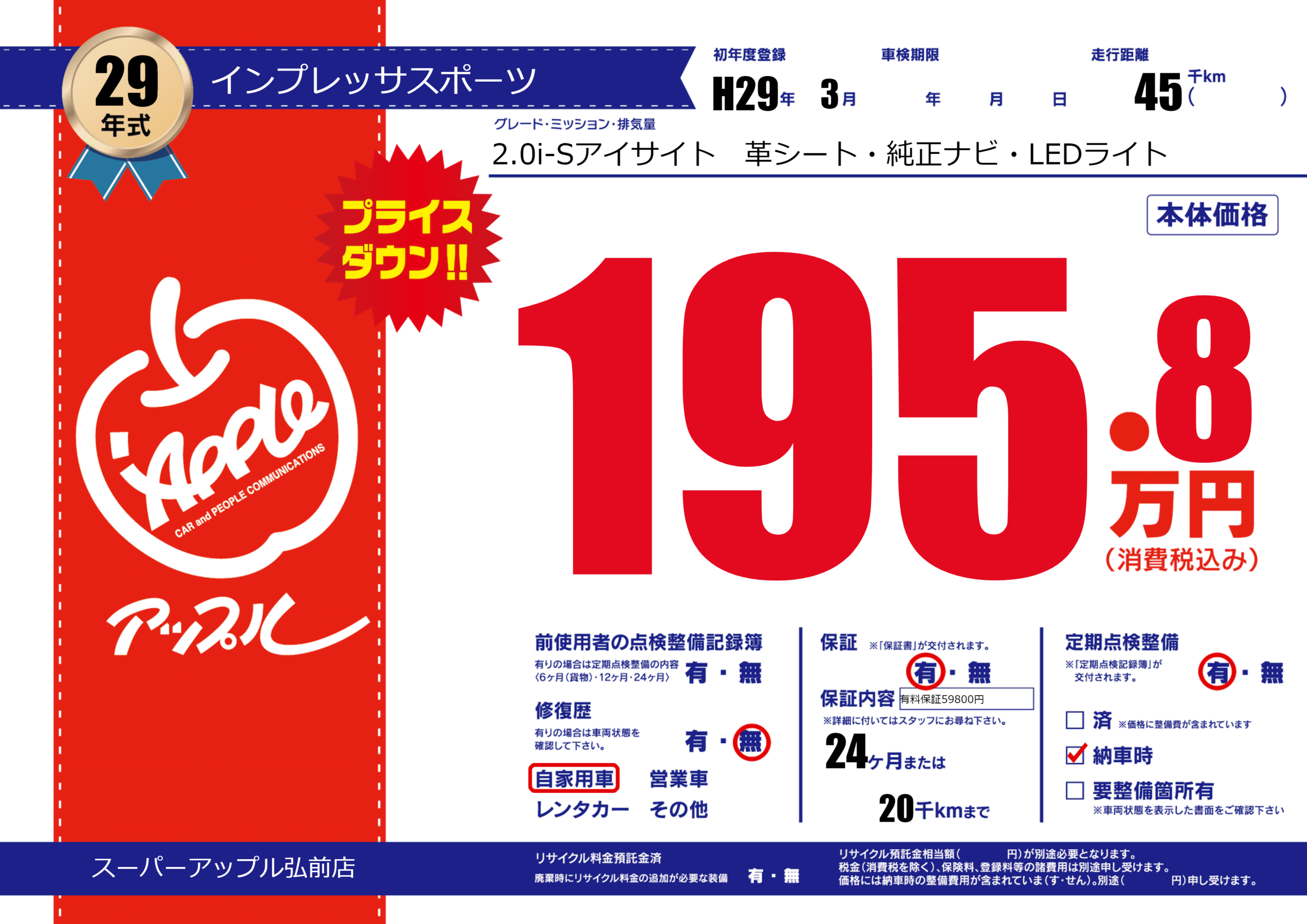 | 車名 | インプレッサスポーツ | グレード ミッション 排気量 |