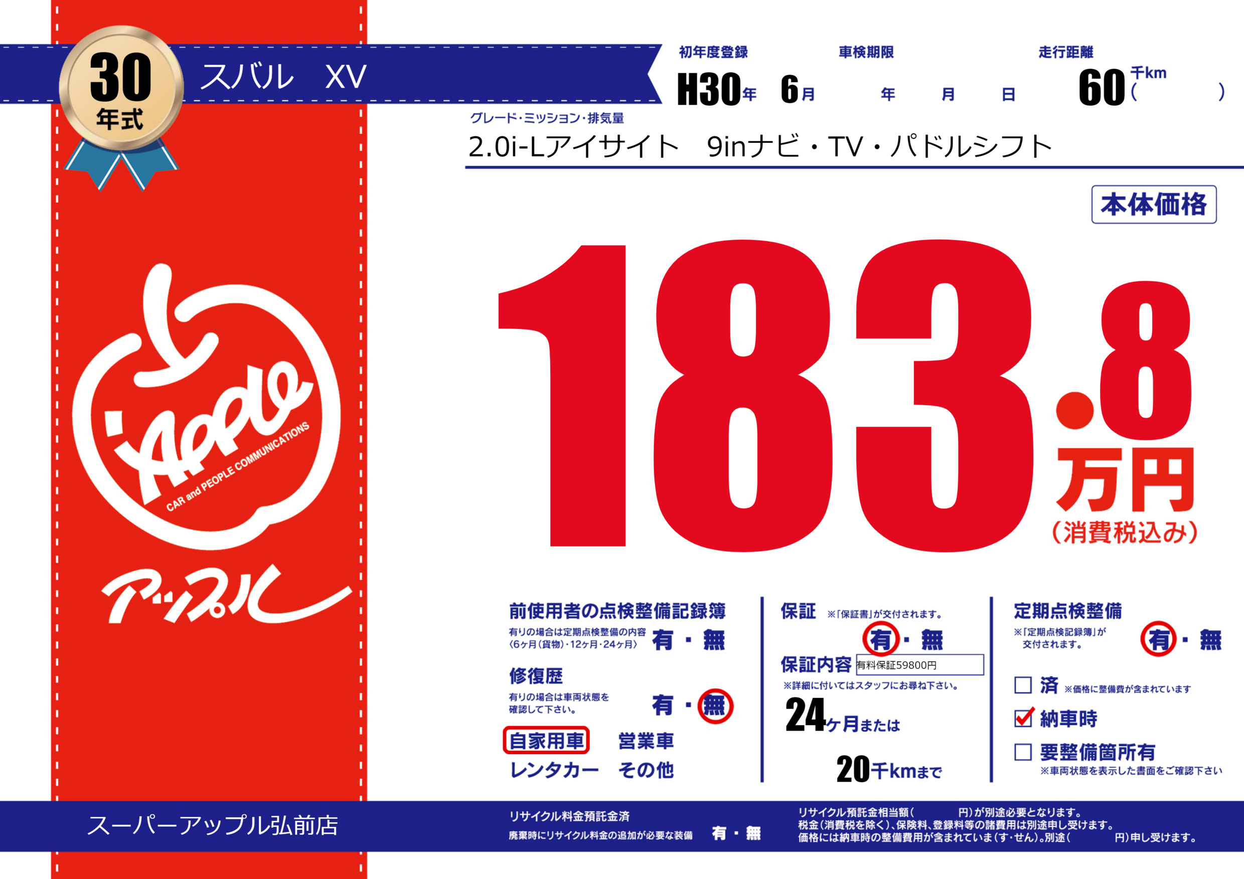 | 車名 | スバル XV | グレード ミッション 排気量 |