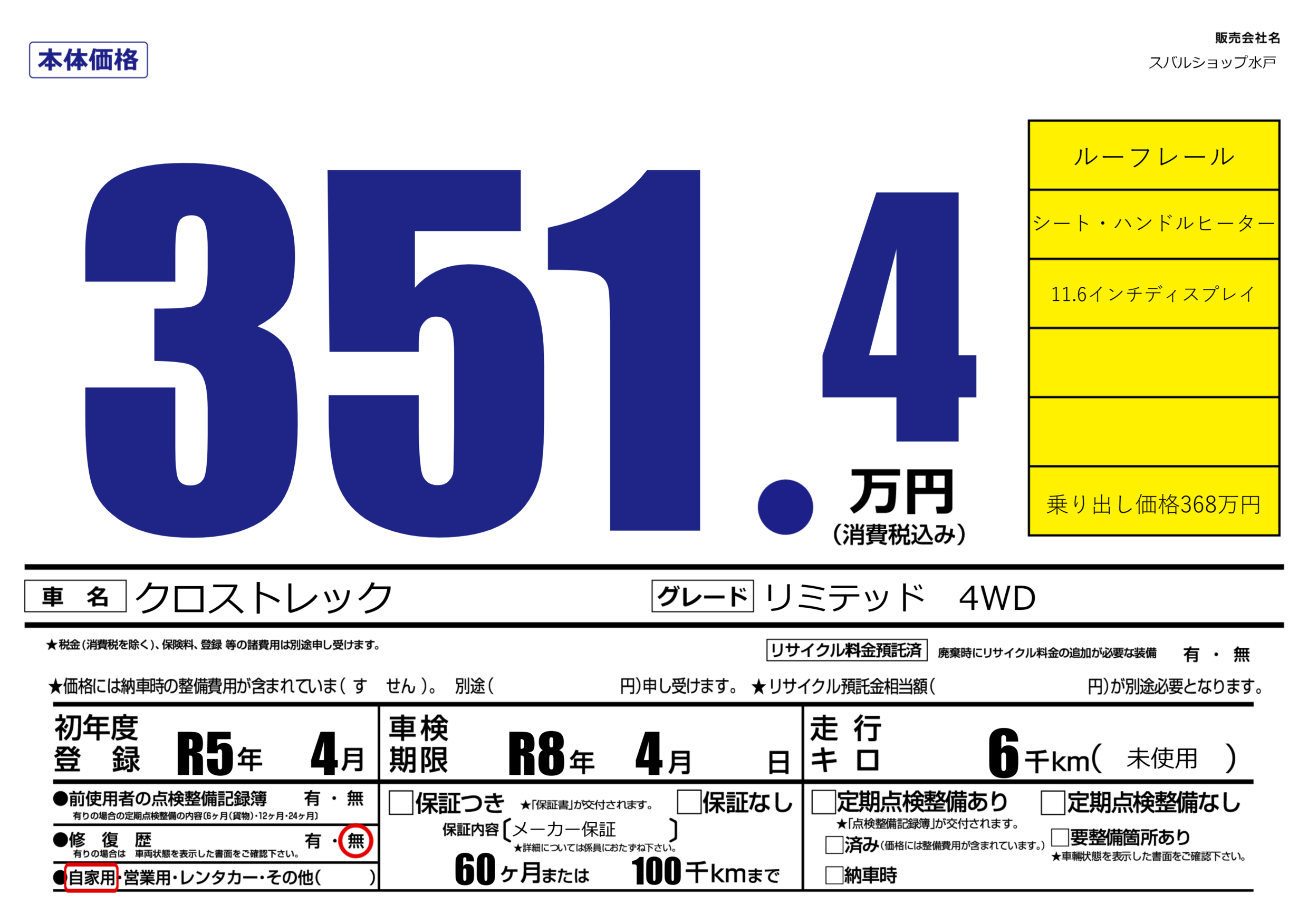 | 走行キロ | 0.6万km | 初年度登録 | R5年4月 |