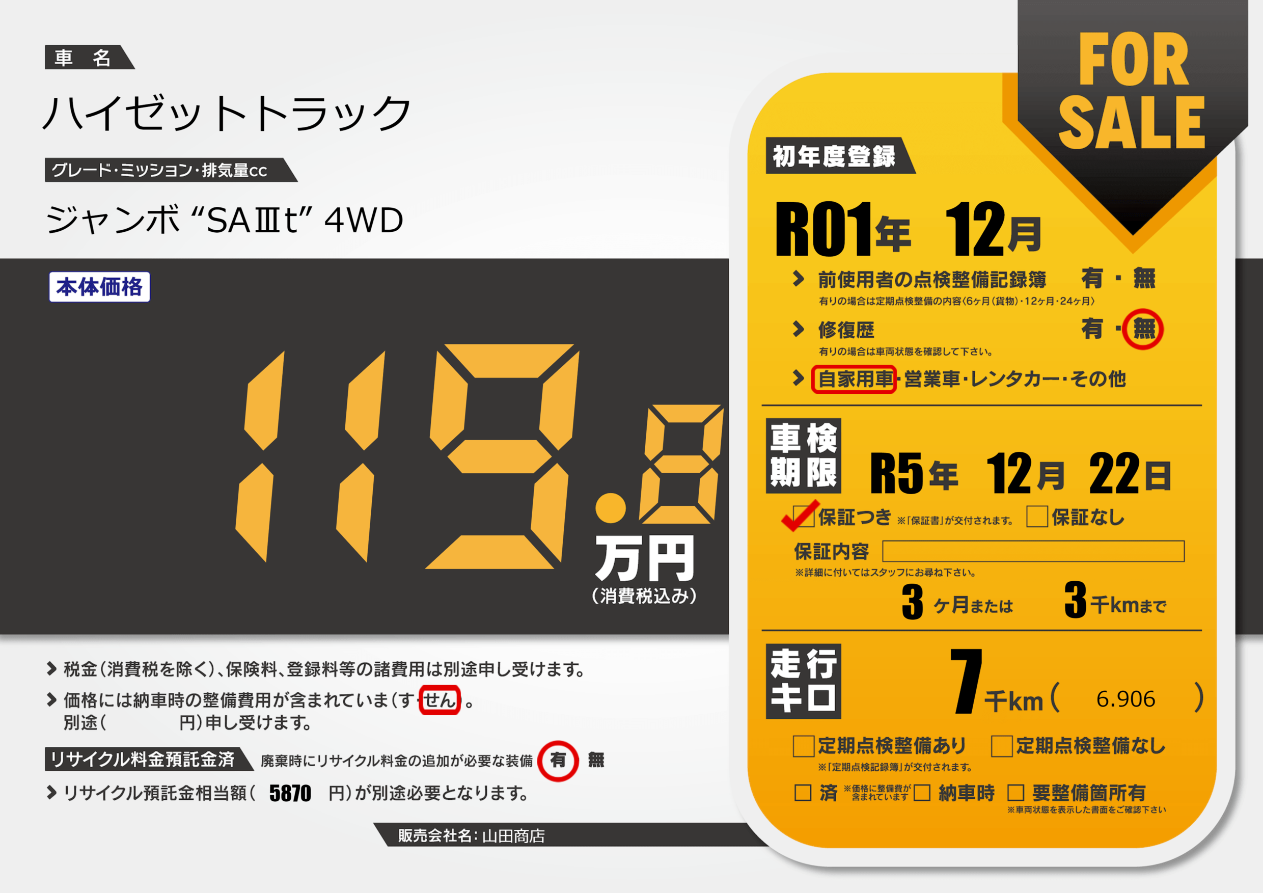 | 車名 | ハイゼットトラック | グレード ミッション 排気量 |