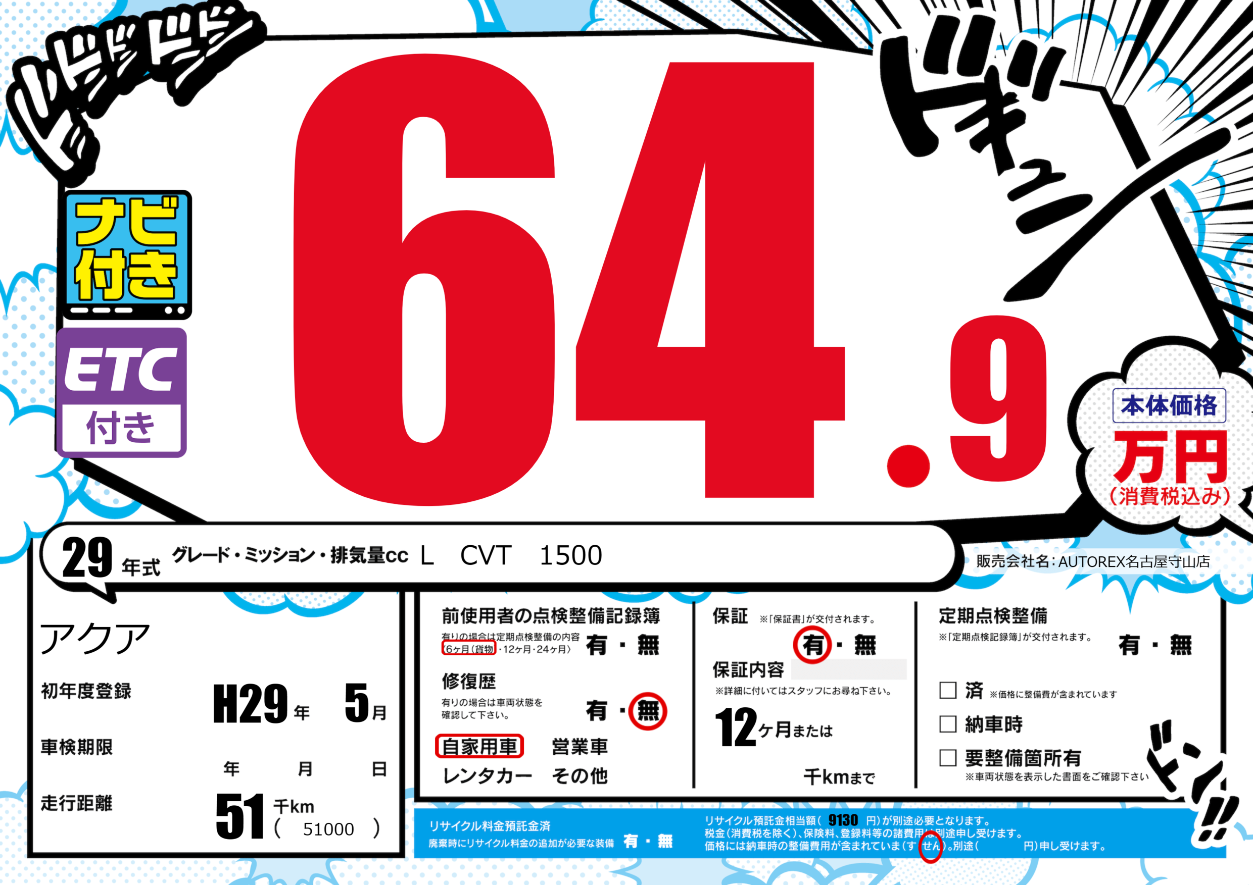 | 走行キロ | 5.1万km | 初年度登録 | H29年5月 |
