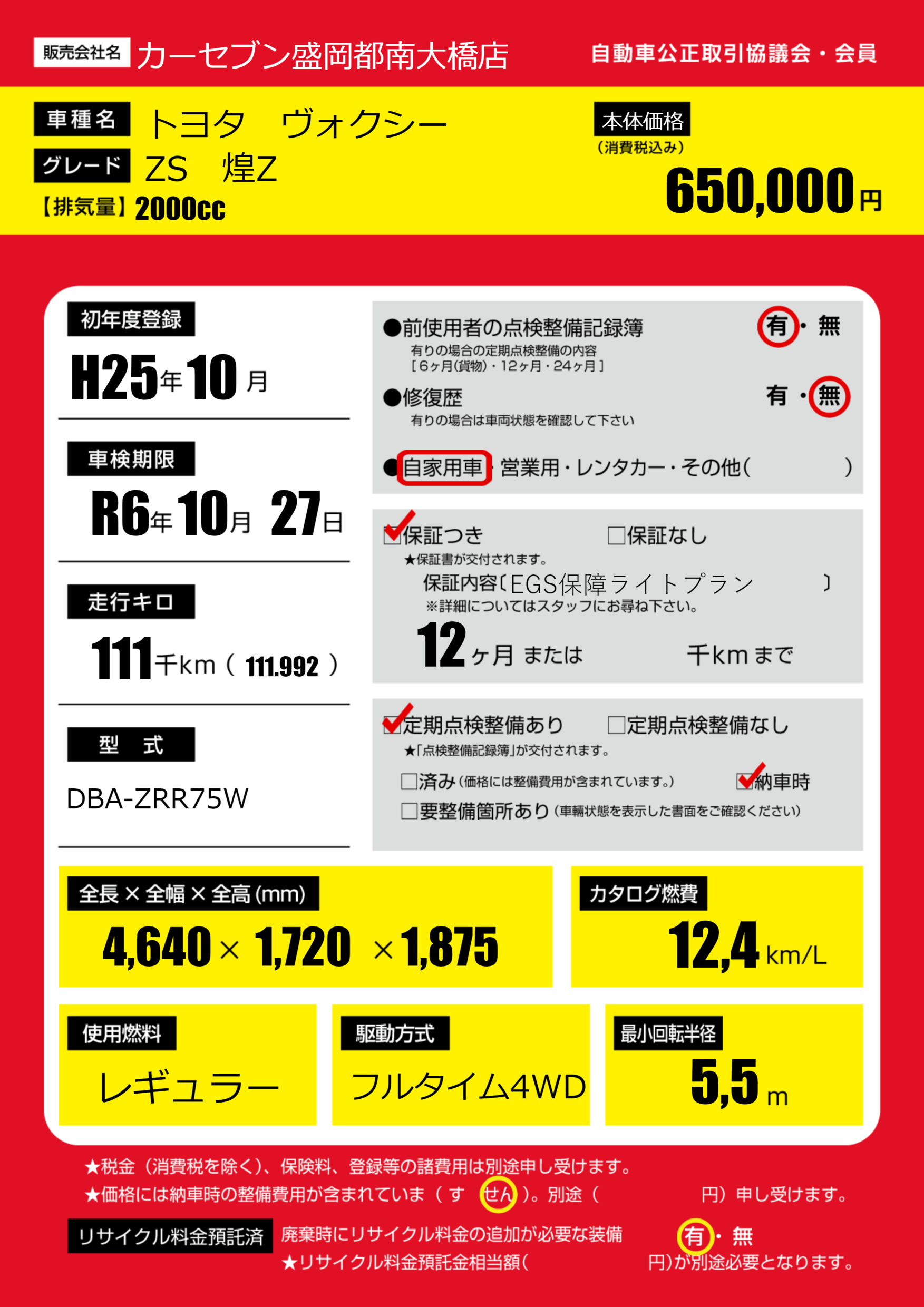 | 車名 | トヨタ ヴォクシー | グレード ミッション 排気量 |