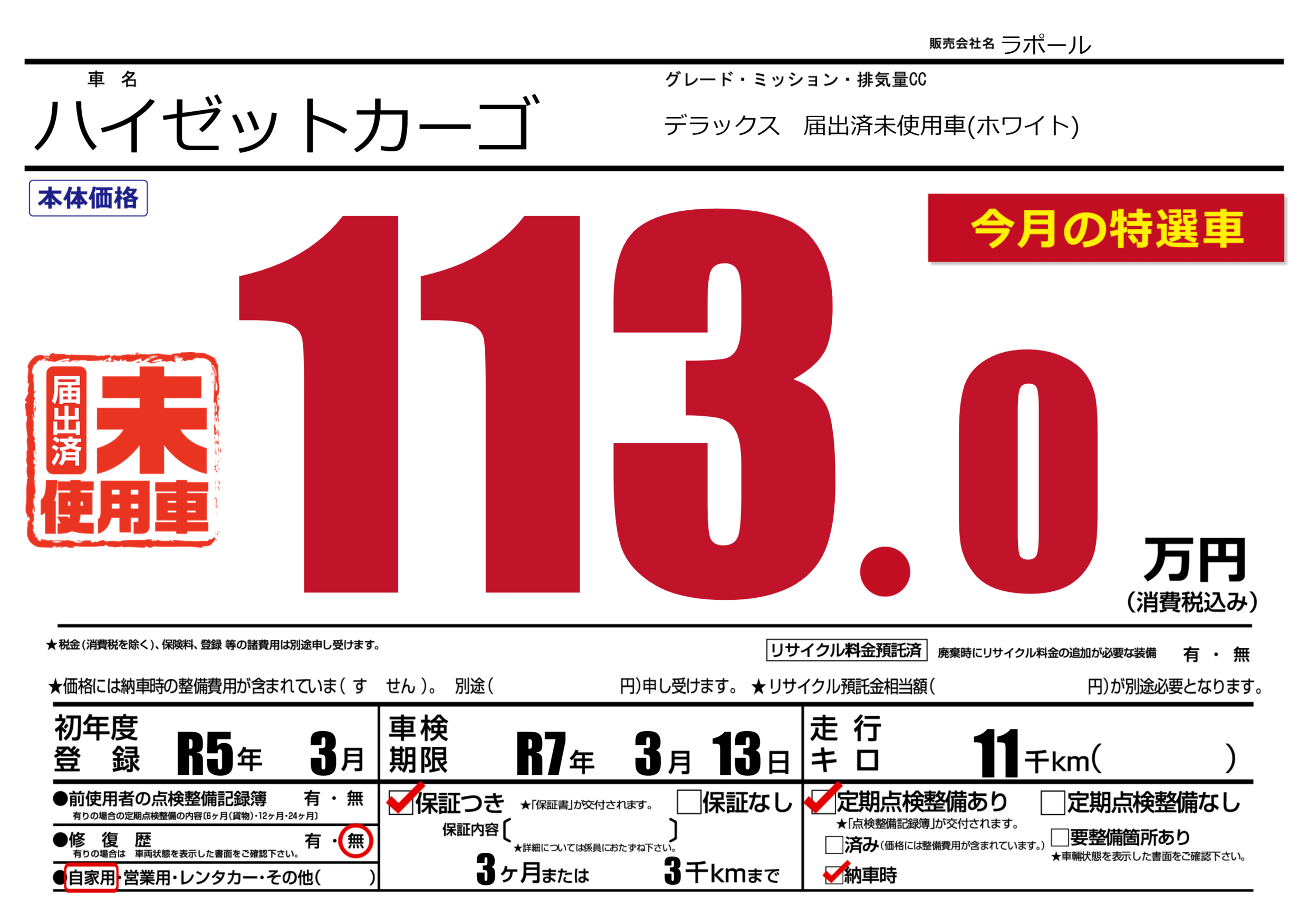 保証付き 保証内容(---) 3ヶ月または(3)千kmまで |