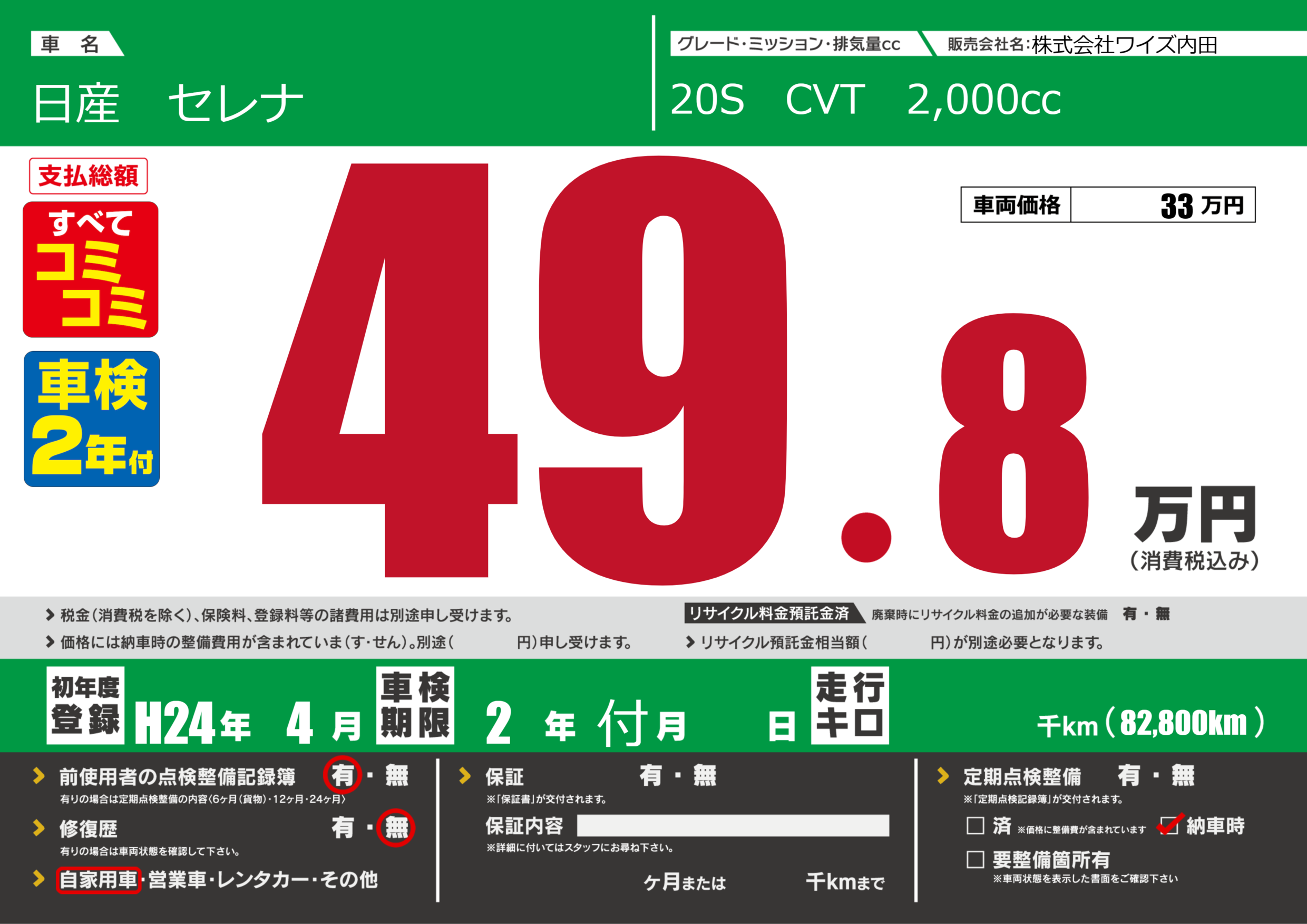 | 車名 | 日産 セレナ | グレード ミッション 排気量 |