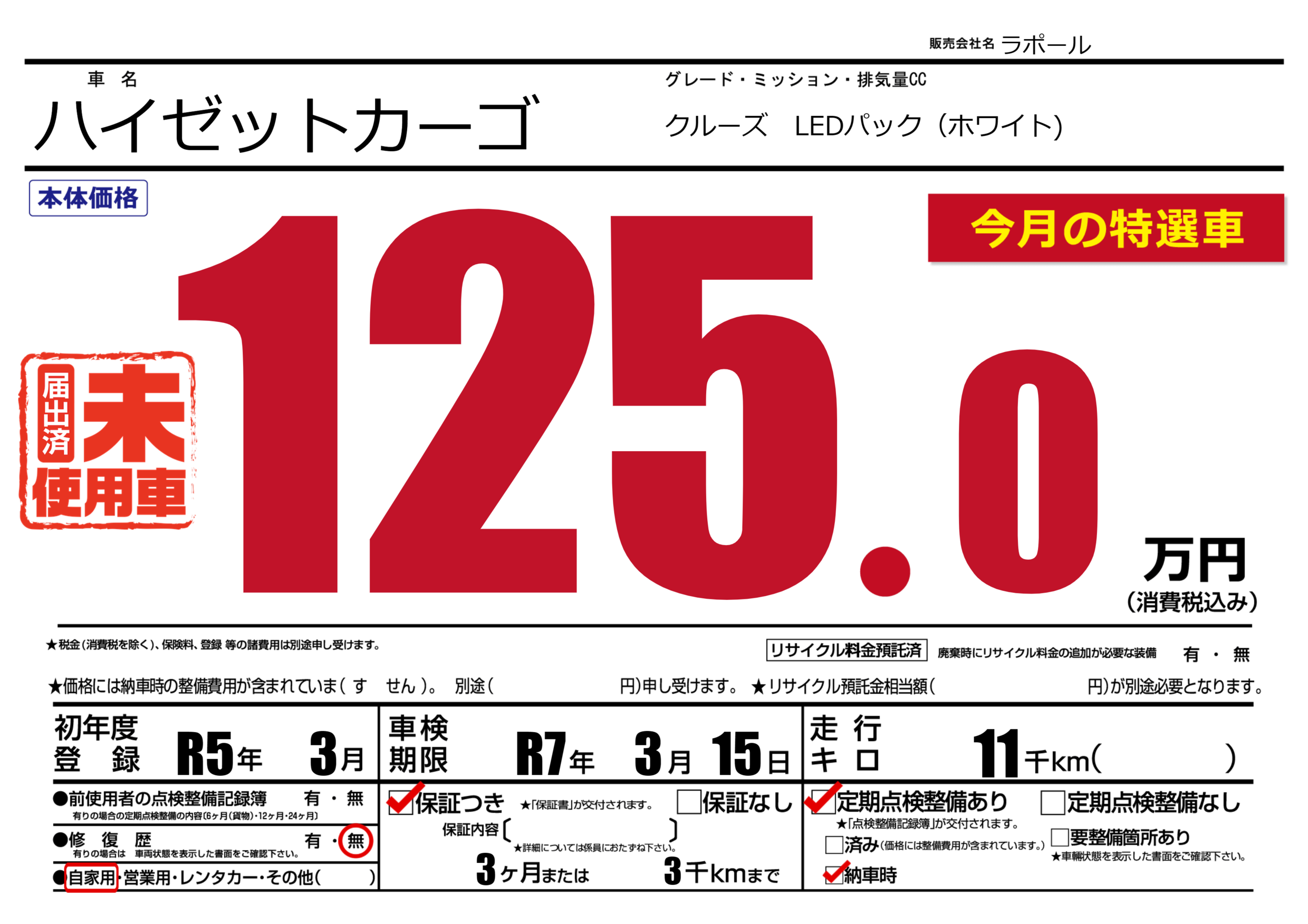 | 走行キロ | 1.1万km | 初年度登録 | R5年3月 |