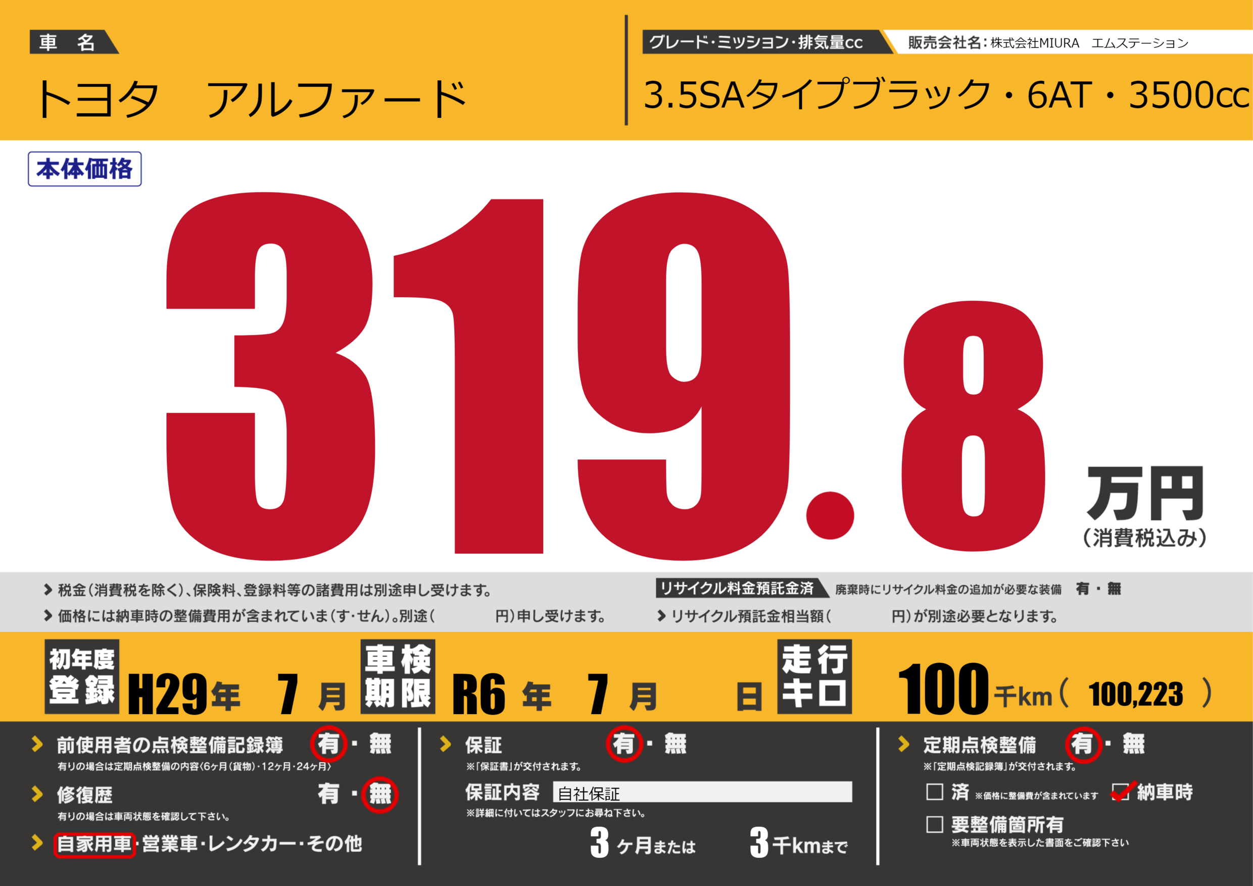 | 車名 | トヨタ アルファード | グレード ミッション 排気量 |