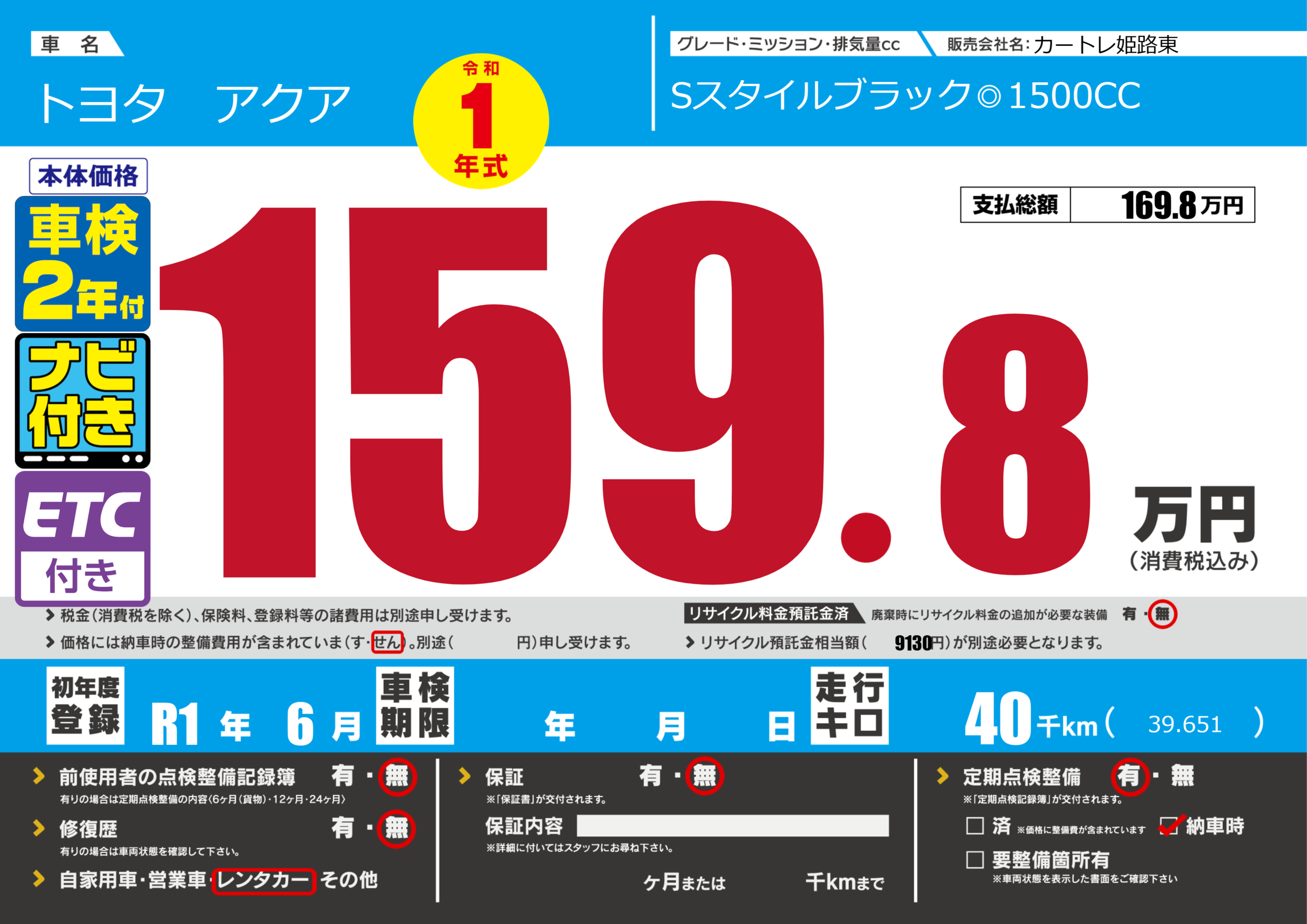 | 車名 | トヨタ アクア | グレード ミッション 排気量 |