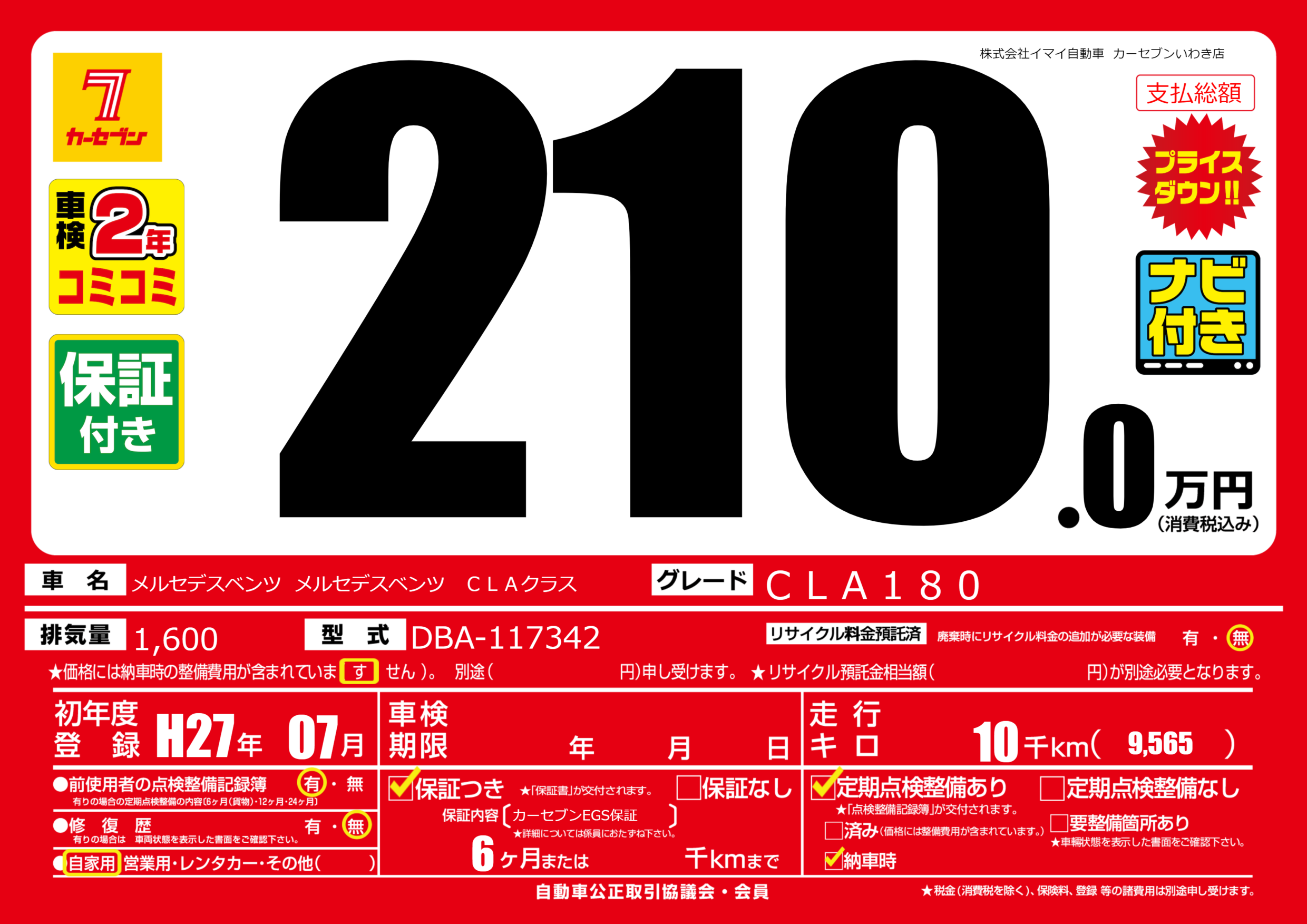 | 車名 | メルセデスベンツ メルセデスベンツ CLAクラス | グレード ミッション 排気量 |