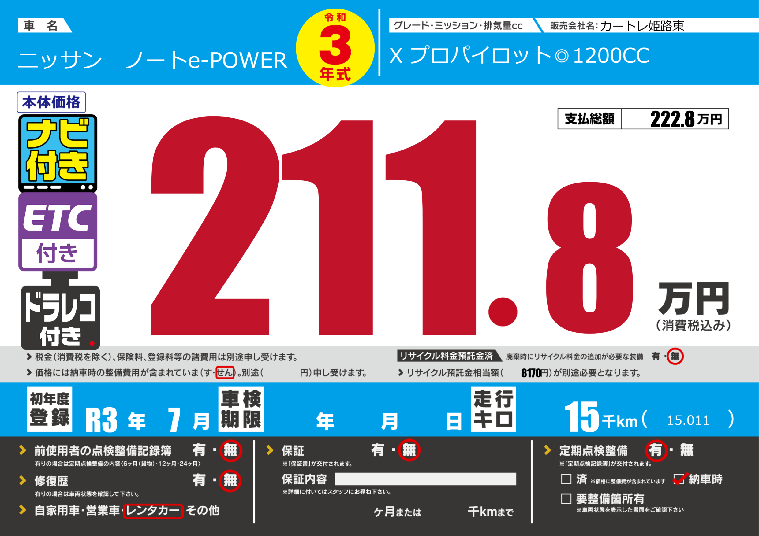 | 車名 | ニッサン ノートe-POWER | グレード ミッション 排気量 |