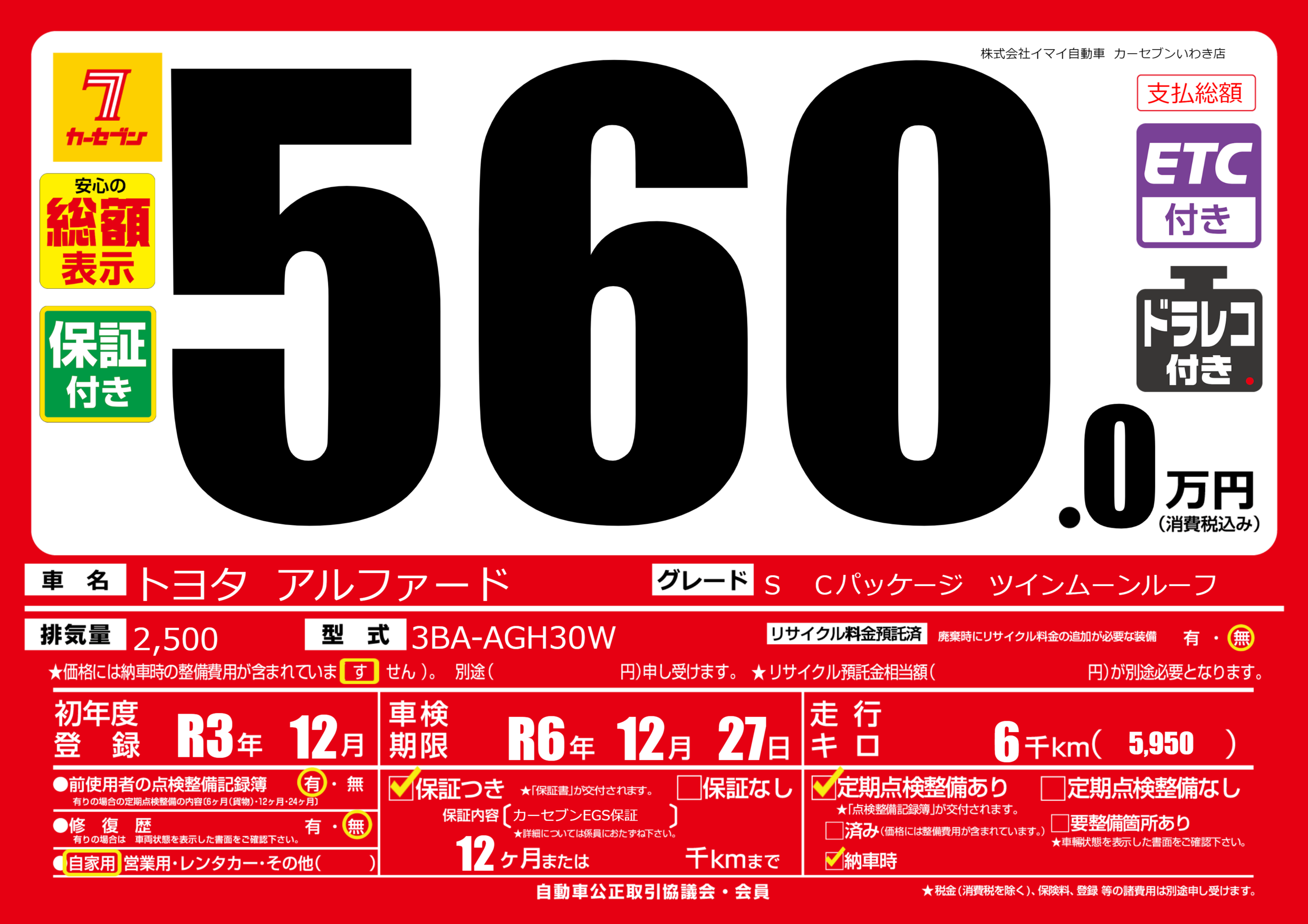 | 車名 | トヨタ アルファード | グレード ミッション 排気量 |