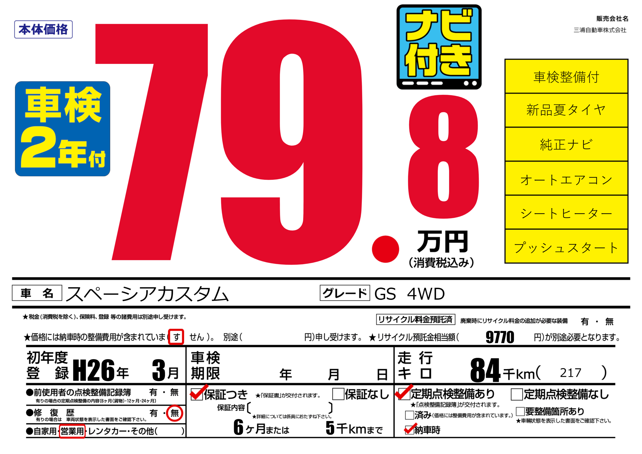 | 車名 | スペーシアカスタム | グレード ミッション 排気量 |