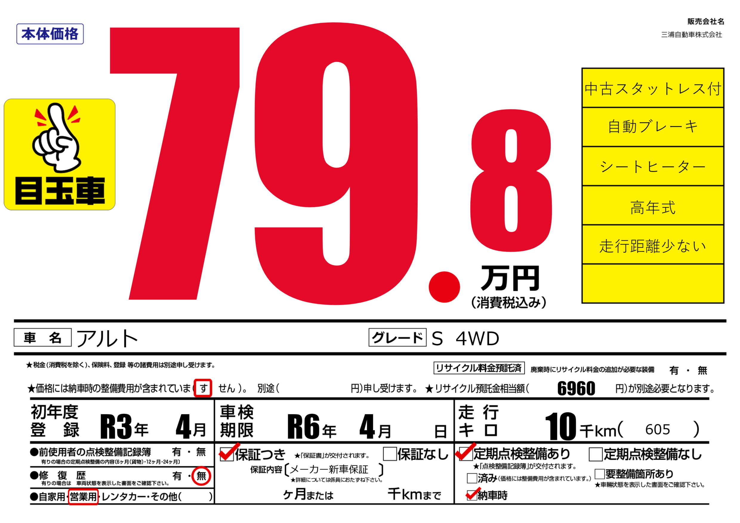 | 定期点検整備 | 定期点検整備あり 納車時あり | ||
