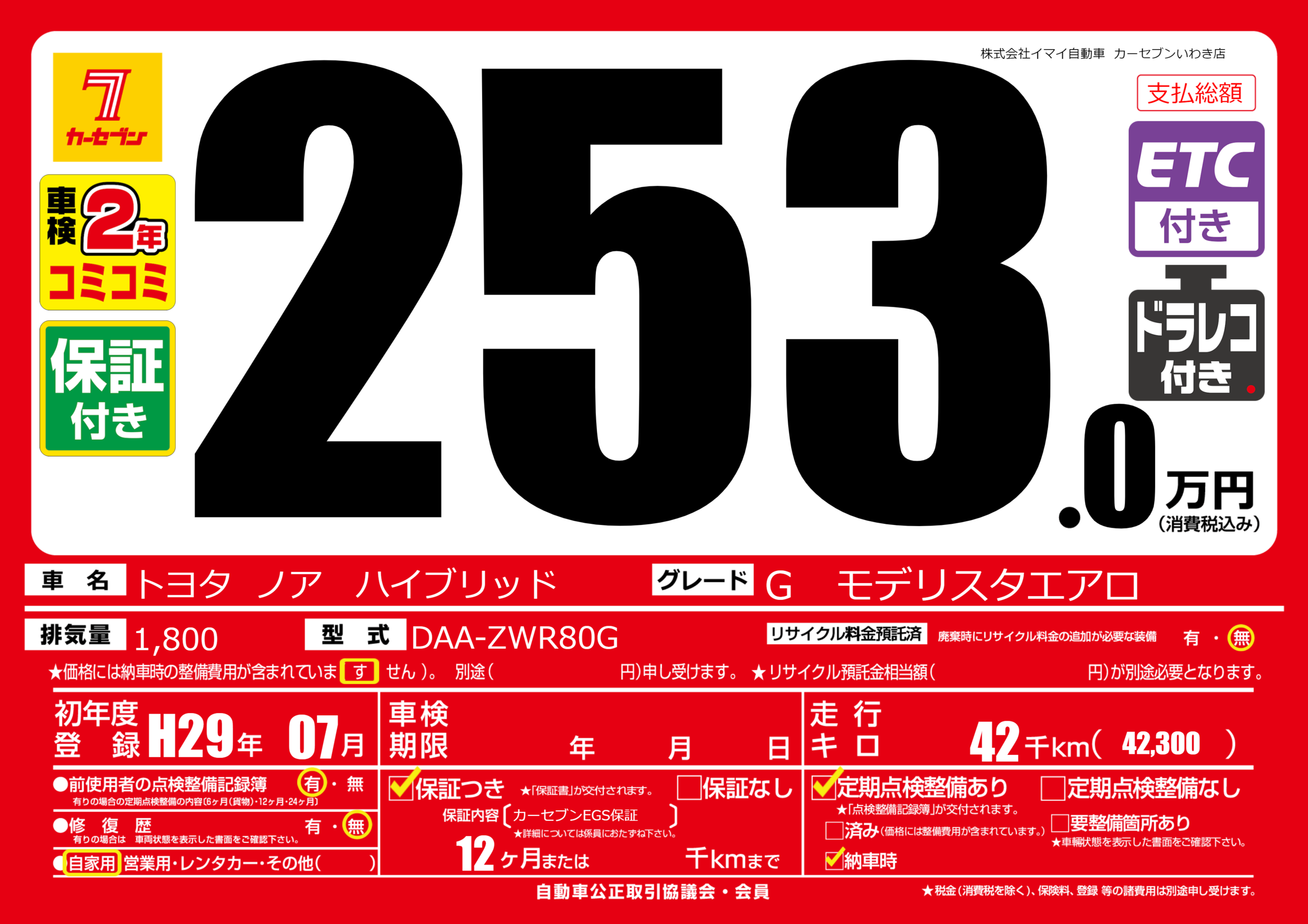 | 車名 | トヨタ ノア ハイブリッド | グレード ミッション 排気量 |