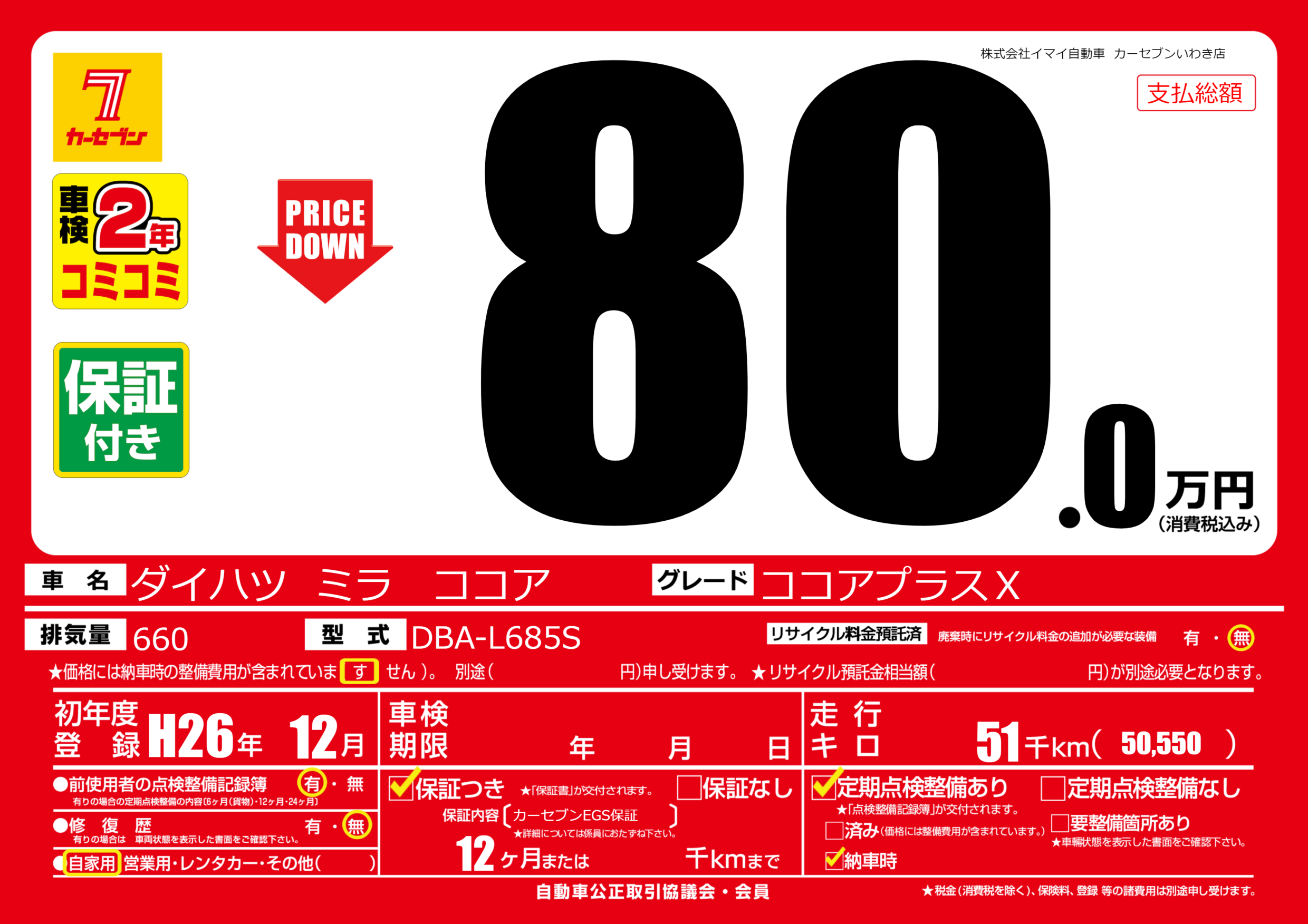 | 走行キロ | 5.1万km | 初年度登録 | H26年12月 |