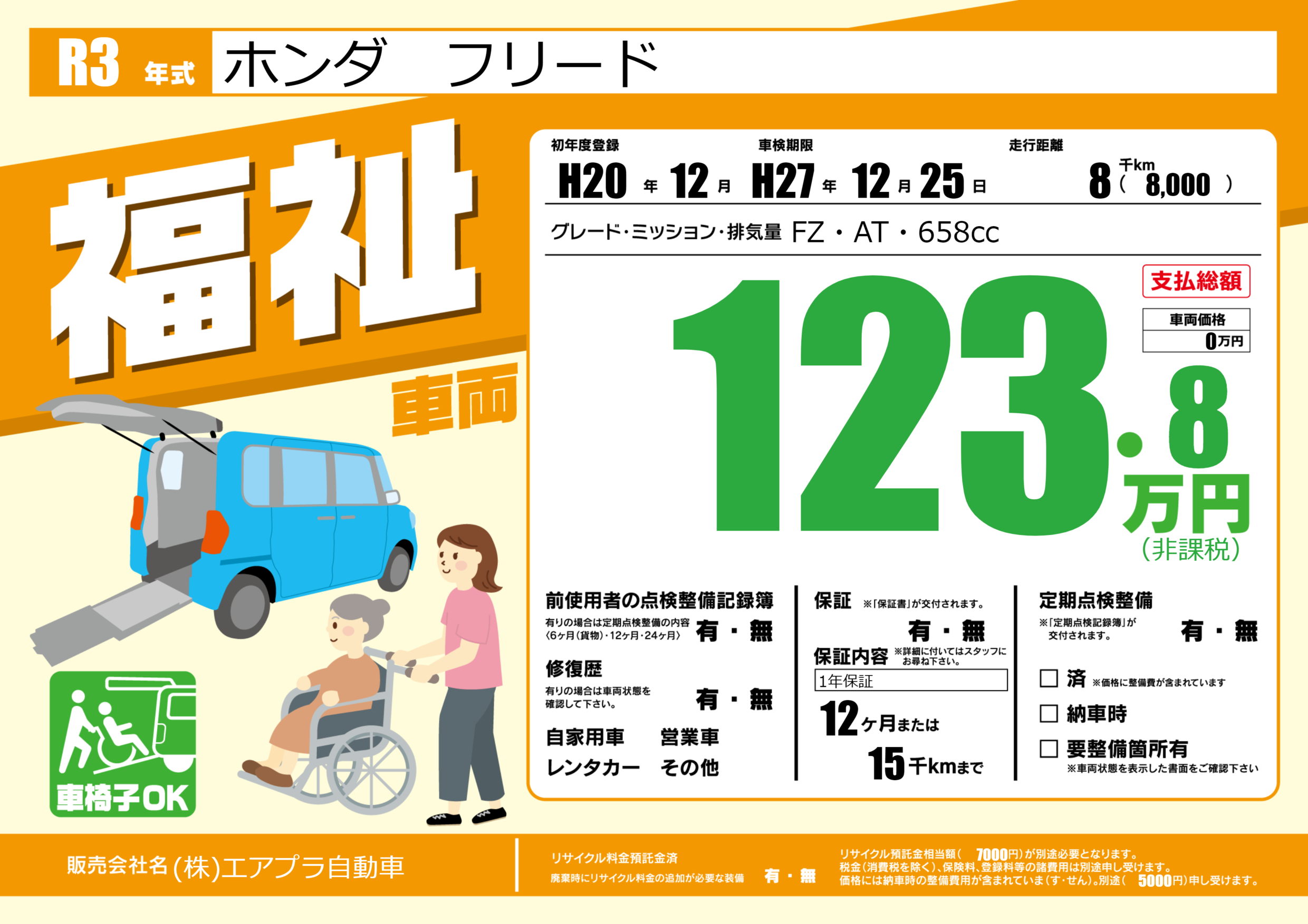 | 車名 | ホンダ フリード | グレード ミッション 排気量 |