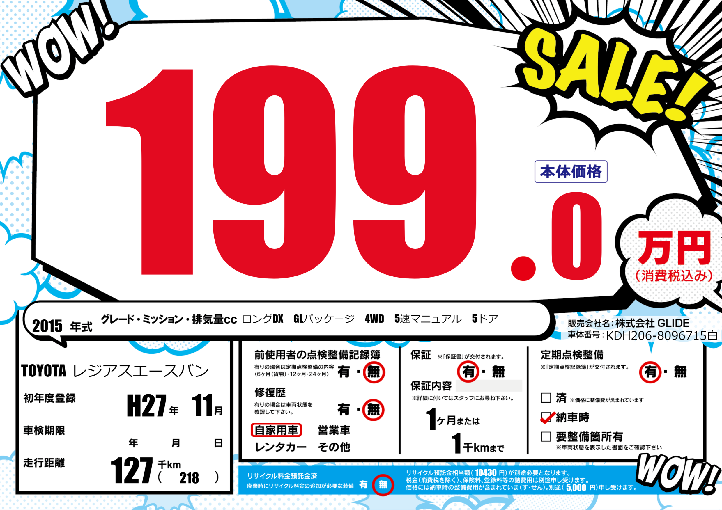 | 車名 | TOYOTA レジアスエースバン | グレード ミッション 排気量 |