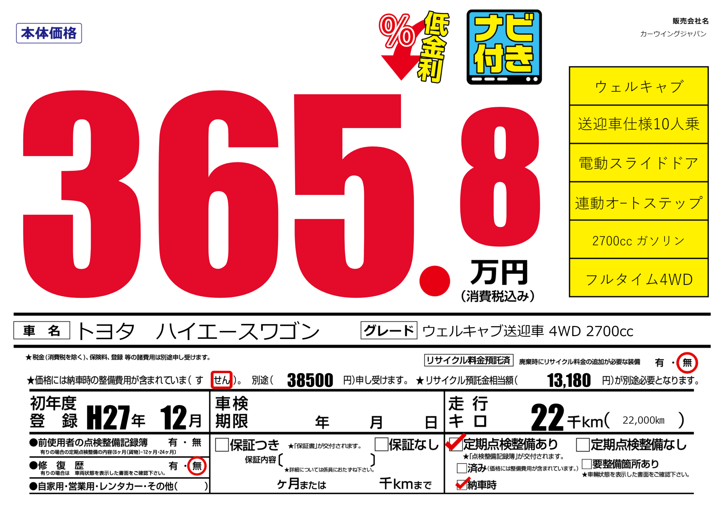 | 車名 | トヨタ ハイエースワゴン | グレード ミッション 排気量 |