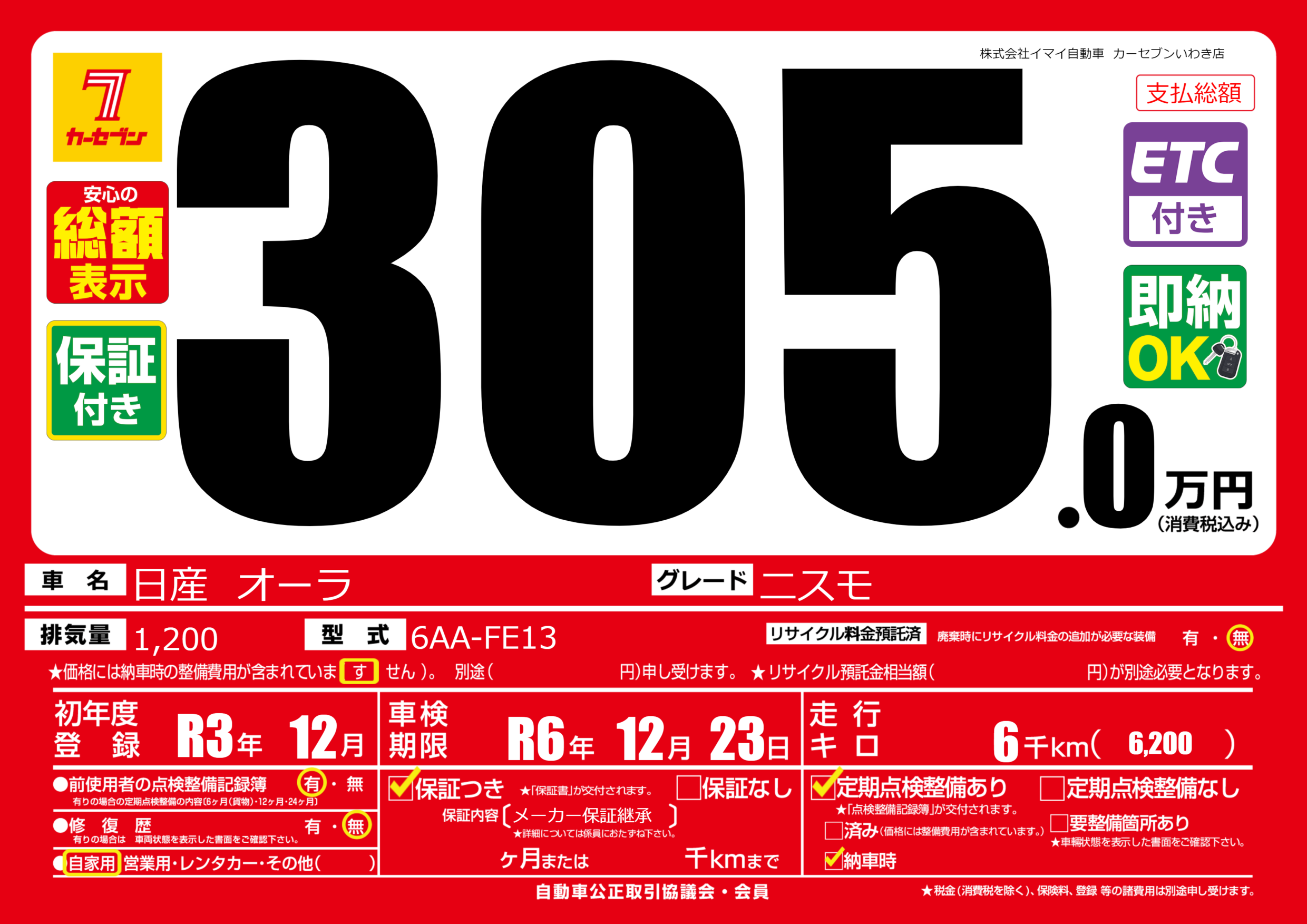 | 車名 | 日産 オーラ | グレード ミッション 排気量 |