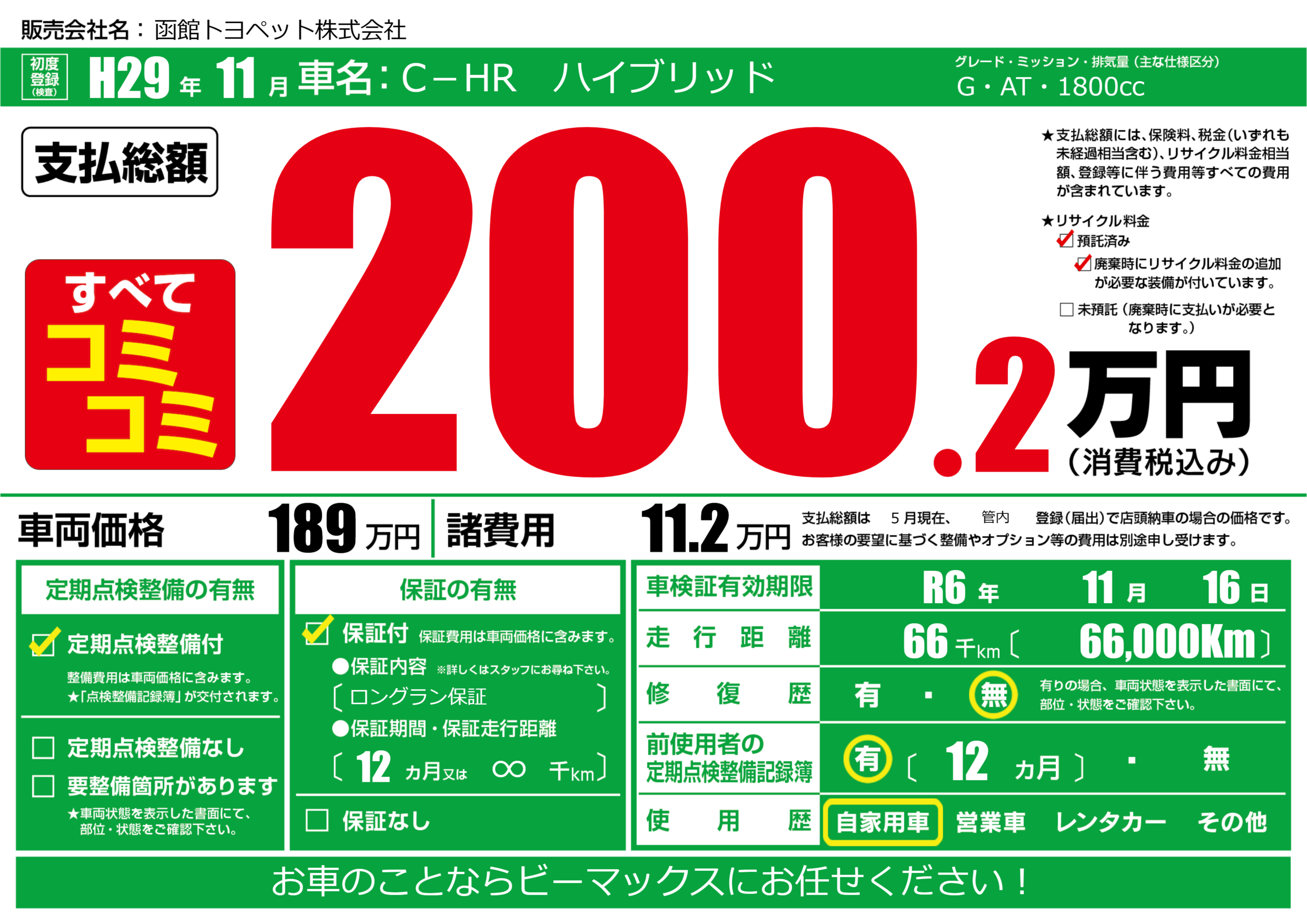 | 車名 | C-HR ハイブリッド | グレード ミッション 排気量 |