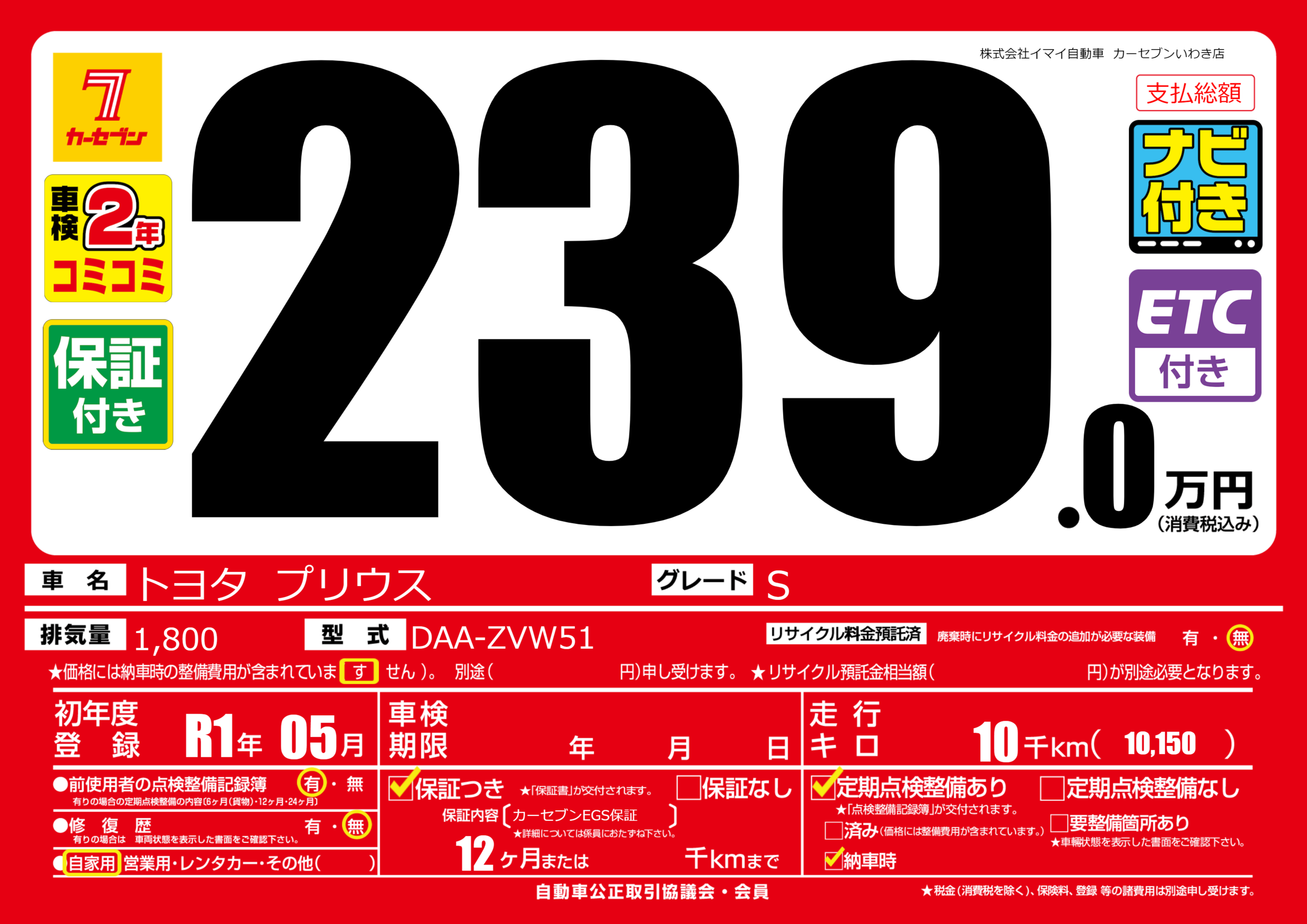 | 車名 | トヨタ プリウス | グレード ミッション 排気量 |