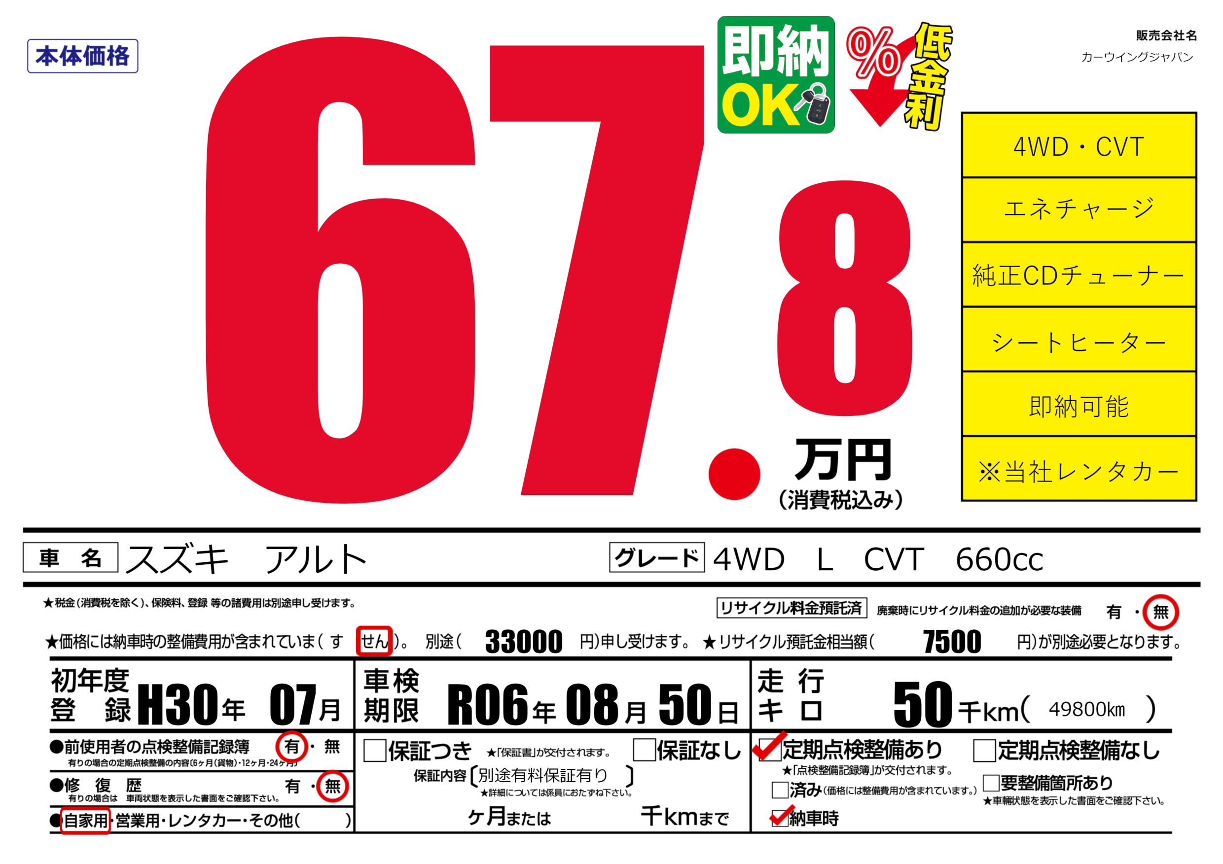 | 車検制限 | R06年 08月 50日 | ||