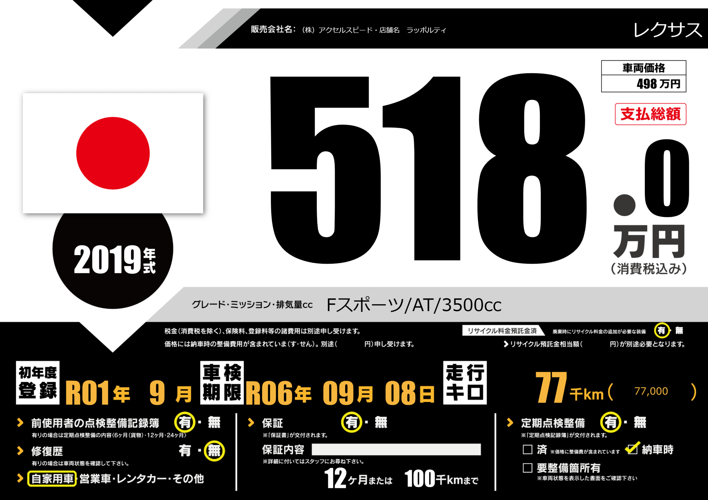 | 走行キロ | 7.7万km | 初年度登録 | R01年9月 |