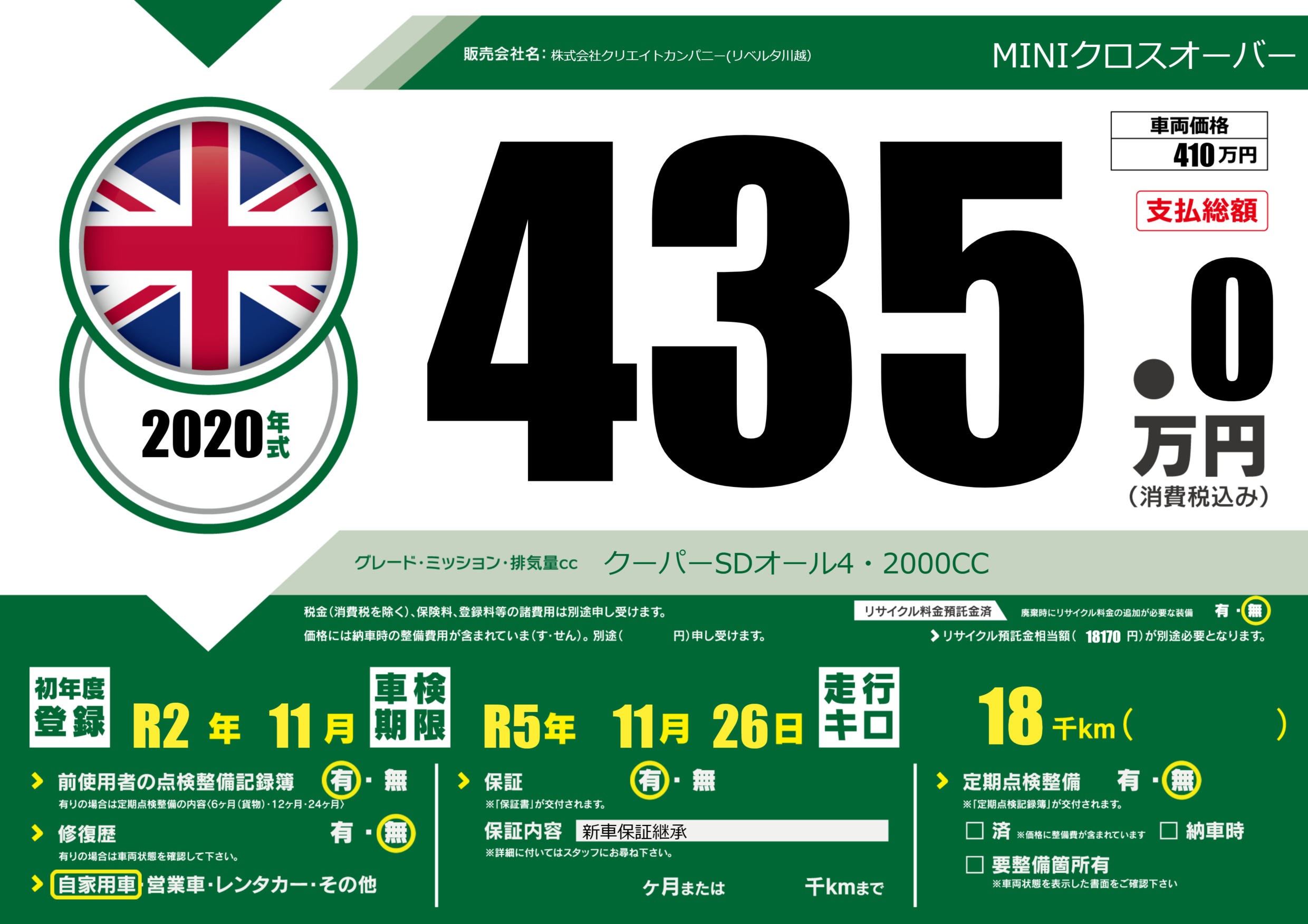 | 車名 | MINIクロスオーバー | グレード ミッション 排気量 |