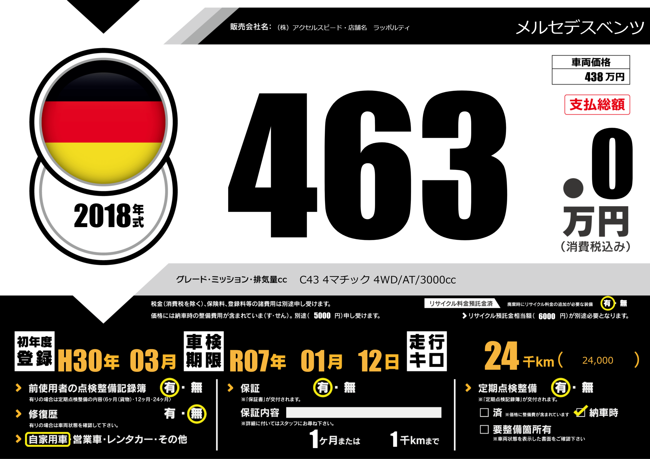 | 車名 | メルセデスベンツ | グレード ミッション 排気量 |