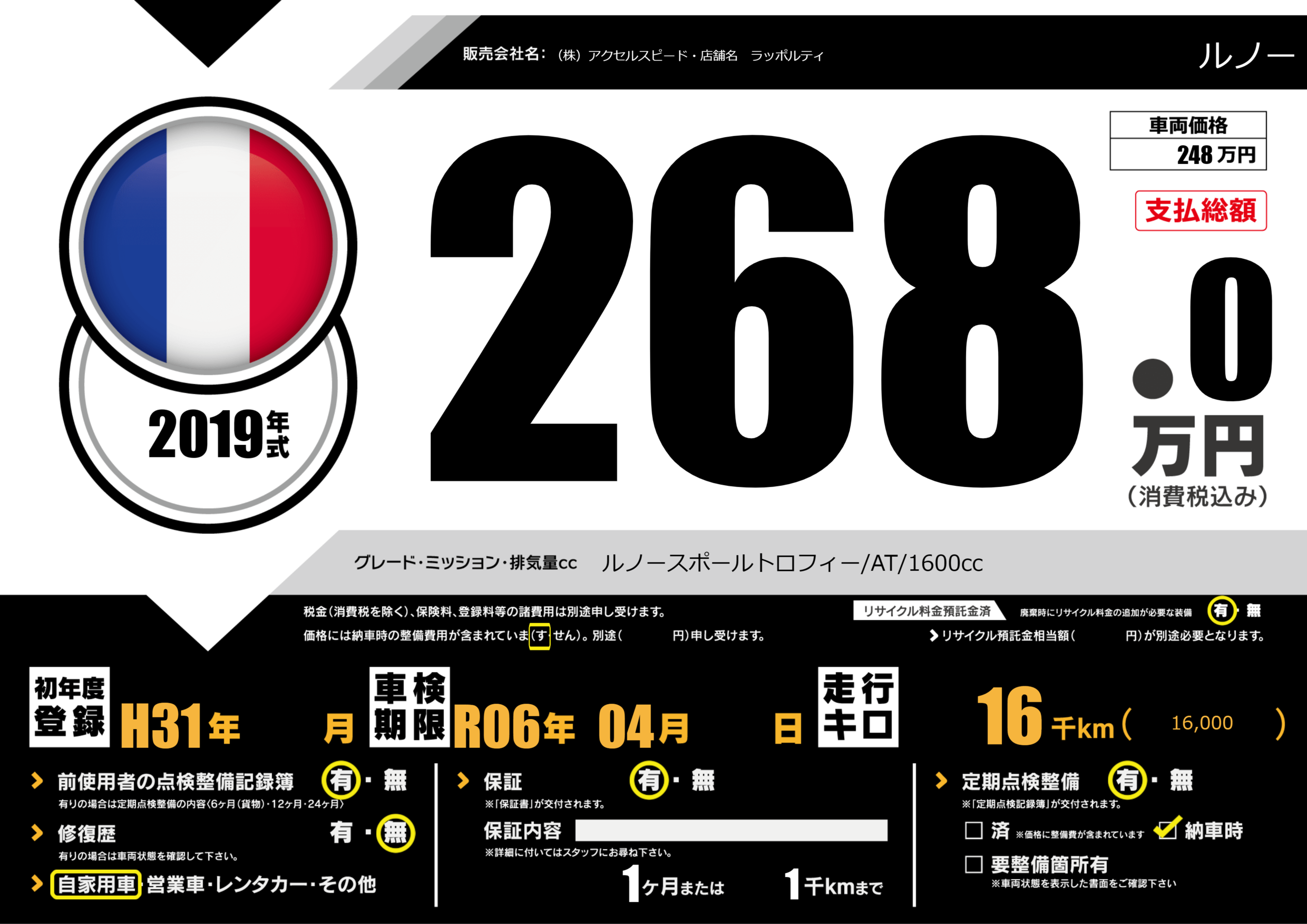 | 車名 | ルノー | グレード ミッション 排気量 |