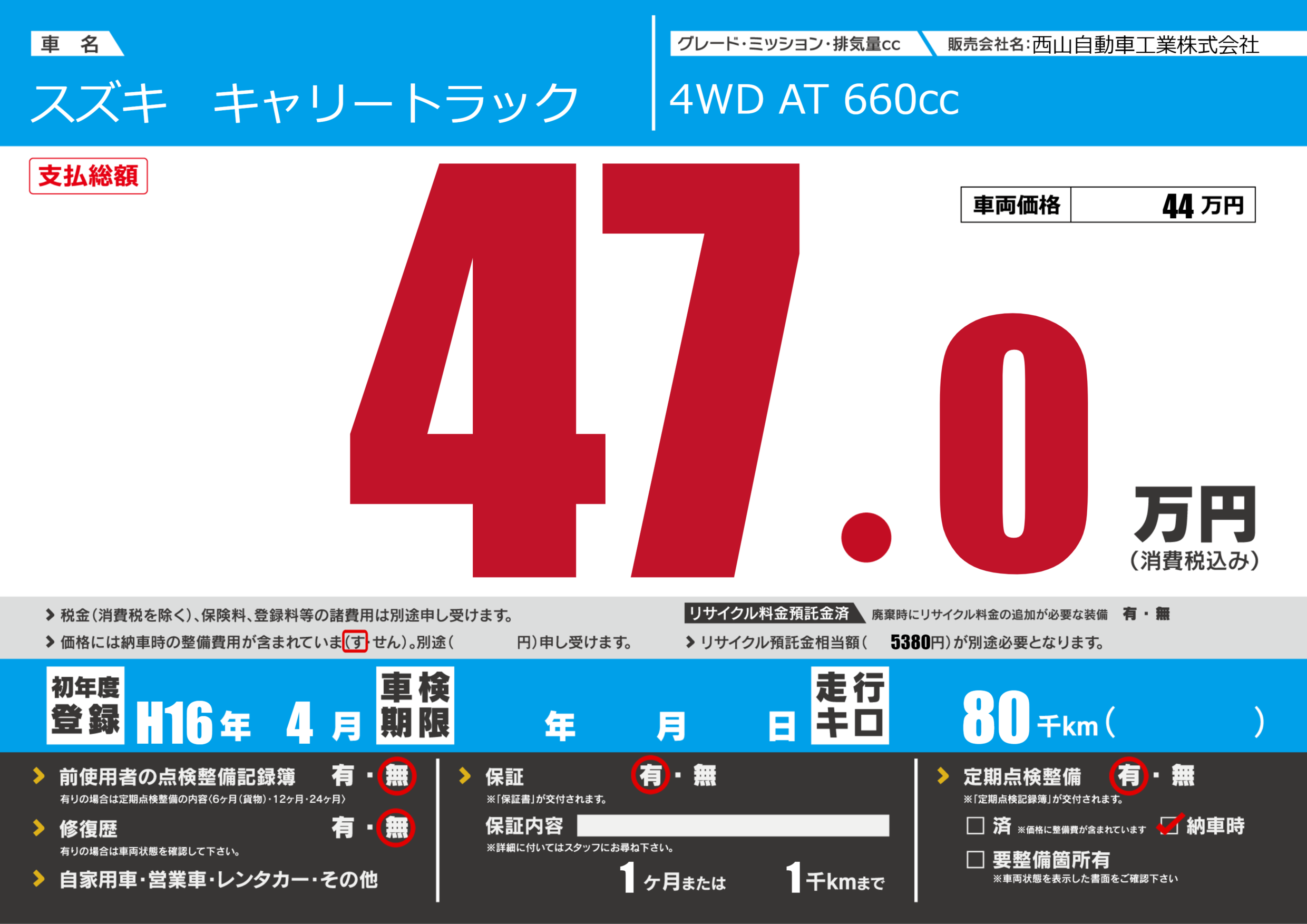 | 定期点検整備 | 定期点検整備あり 納車時あり | ||