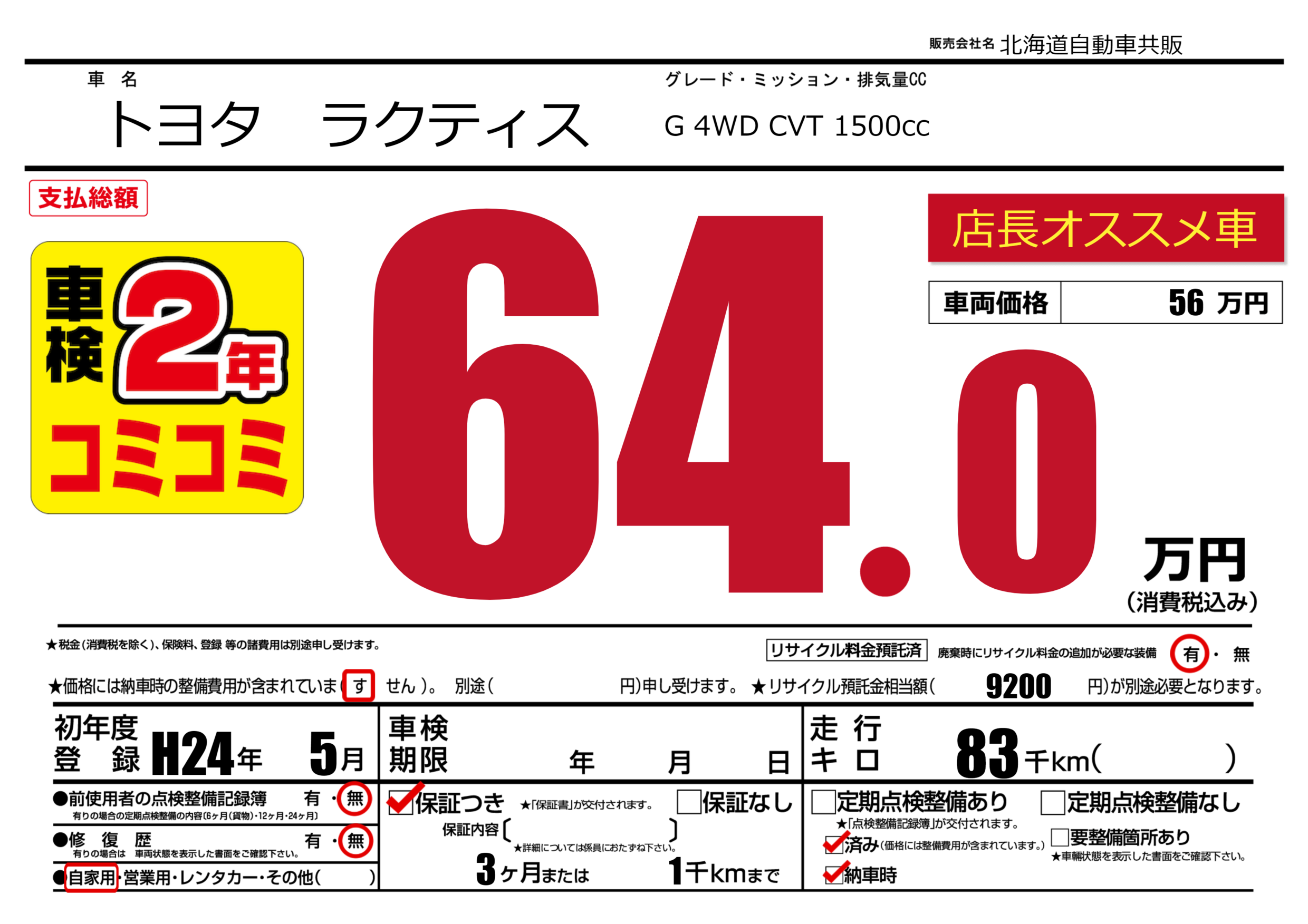 | 車名 | トヨタ ラクティス | グレード ミッション 排気量 |