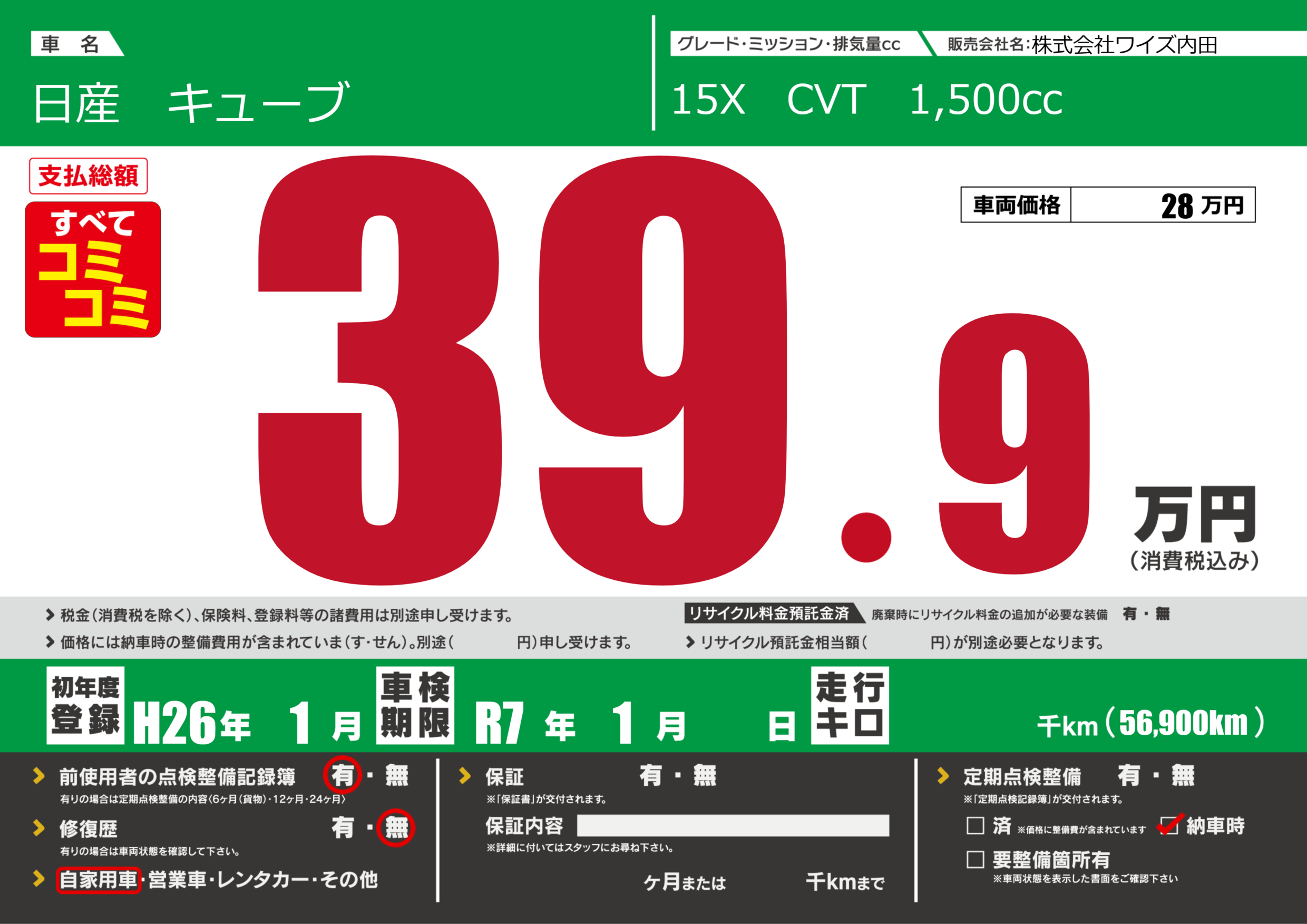 | 車名 | 日産 キューブ | グレード ミッション 排気量 |
