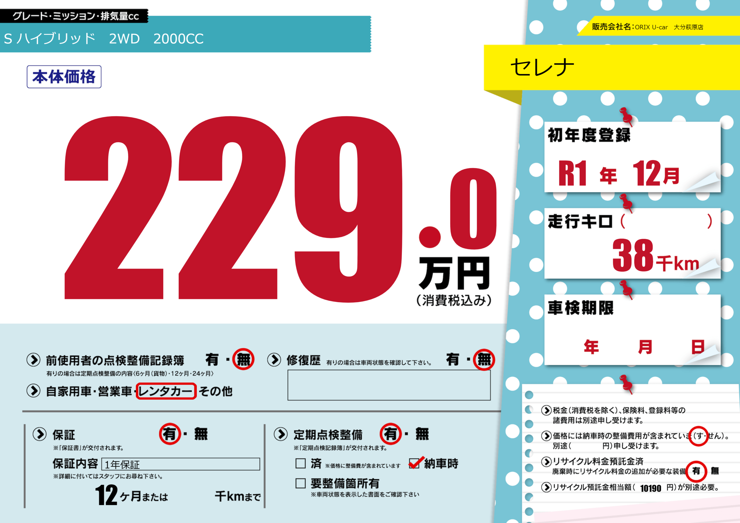 | 定期点検整備 | 定期点検整備あり 納車時あり | ||