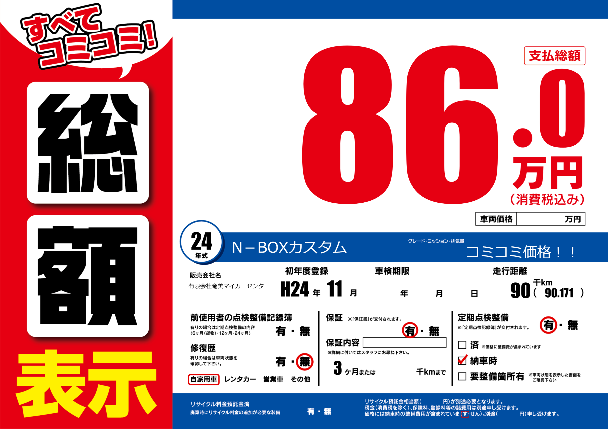 | 定期点検整備 | 定期点検整備あり 納車時あり | ||