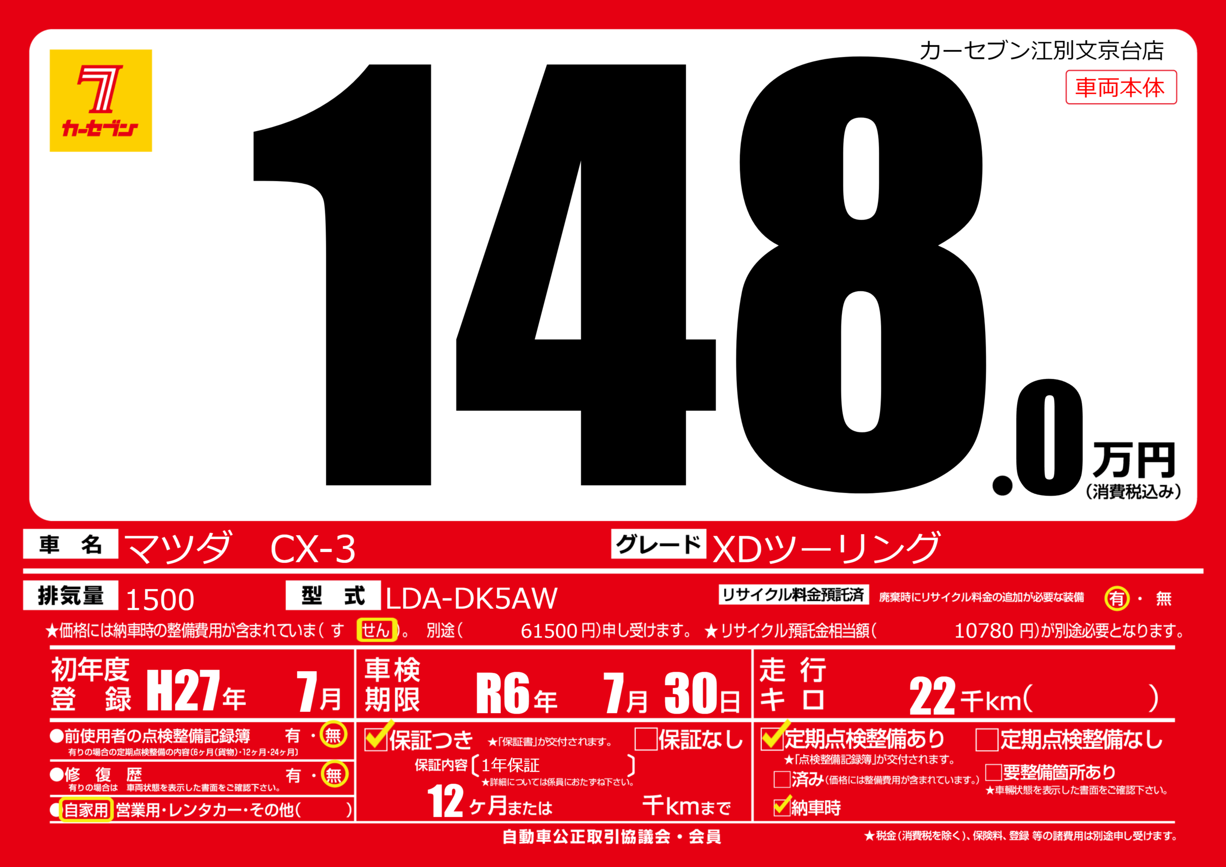 | 車名 | マツダ CX-3 | グレード ミッション 排気量 |